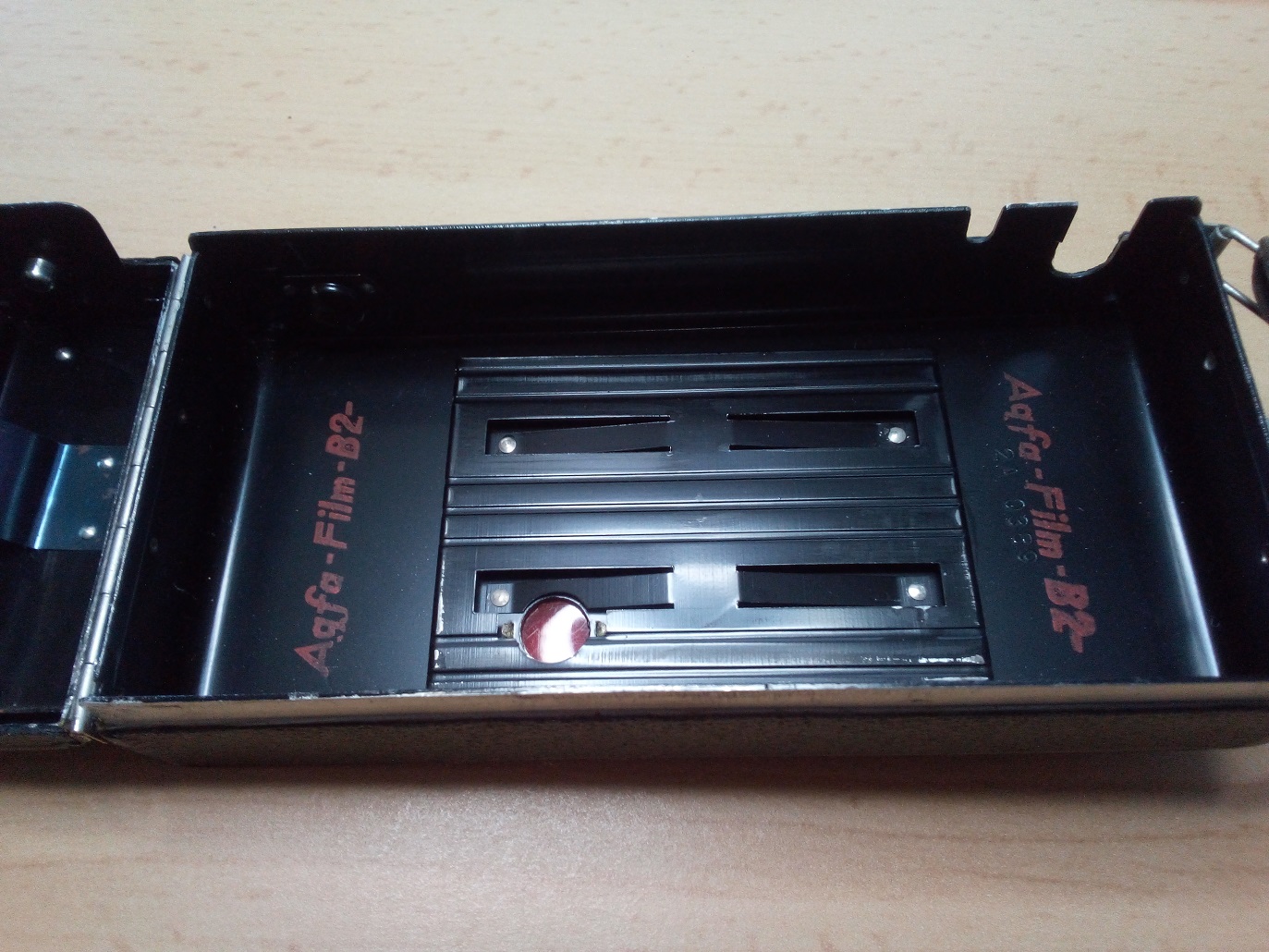 Rückseite: Filmfenster ohne Abdeckung, klappbare Rückwand mit Filmandruckplatte