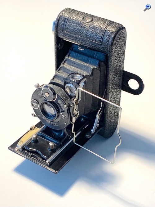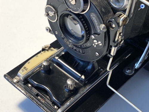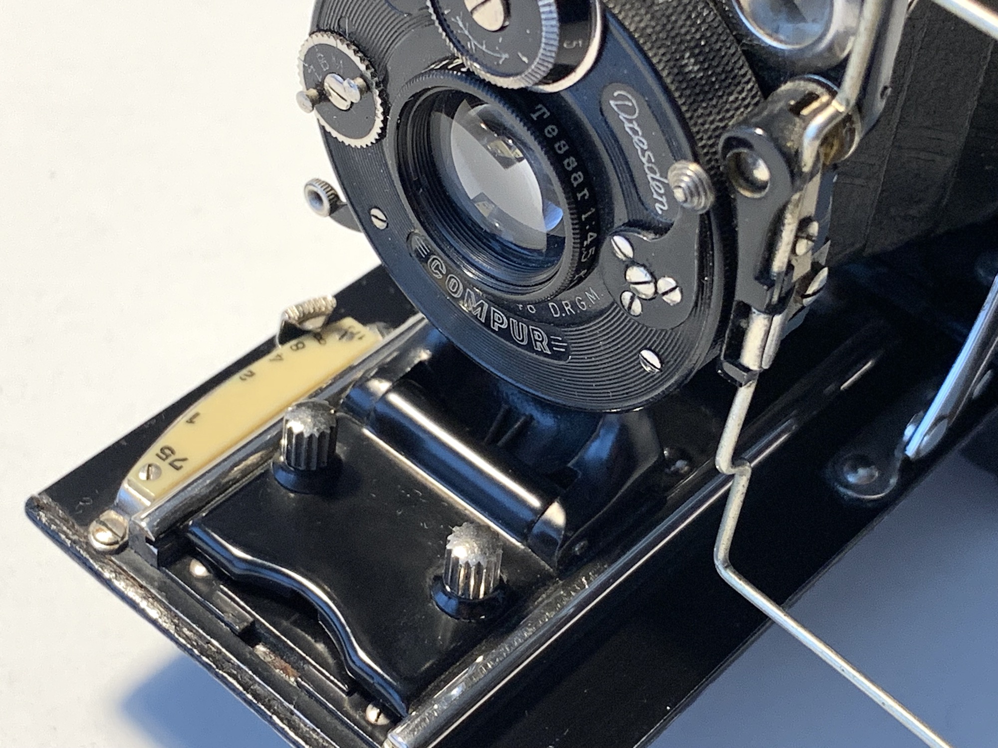 Als Rückwandverschluss fungiert bei diesem Exemplar ein unter der Belederung befindlicher Druckknopf. Das habe ich auch schon an einem anderen Exemplar gesehen; Ich vermute aber, dass man die Konstruktion später geändert hat, denn die meisten Exemplare dieses Modells haben einen Schieber wie die größeren Modelle. Es dürfte sich hier um ein sehr frühes Exemplar handelt, darauf deuten auch Buchstabencode (J) und Seriennummer hin. Verbaut ist hier ein Tessar 4,5/7,5 in Compur 1–300.