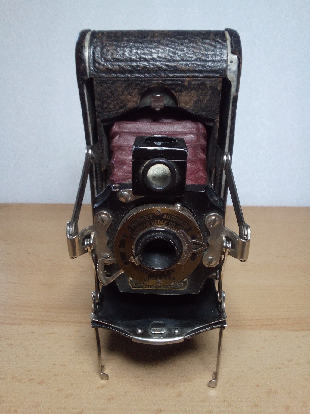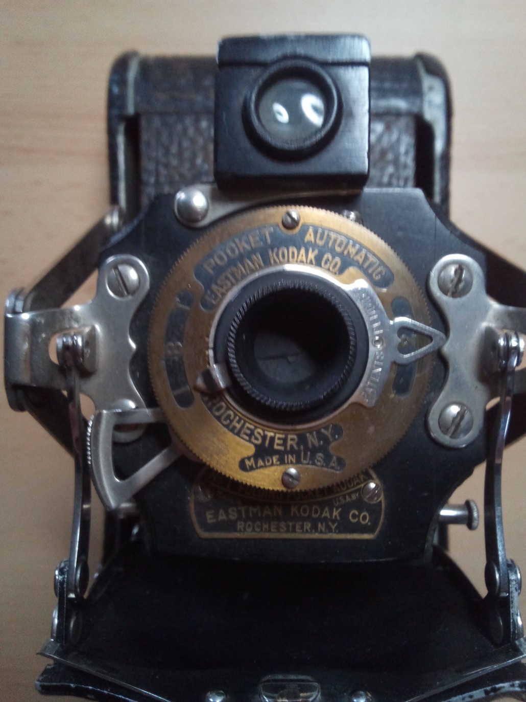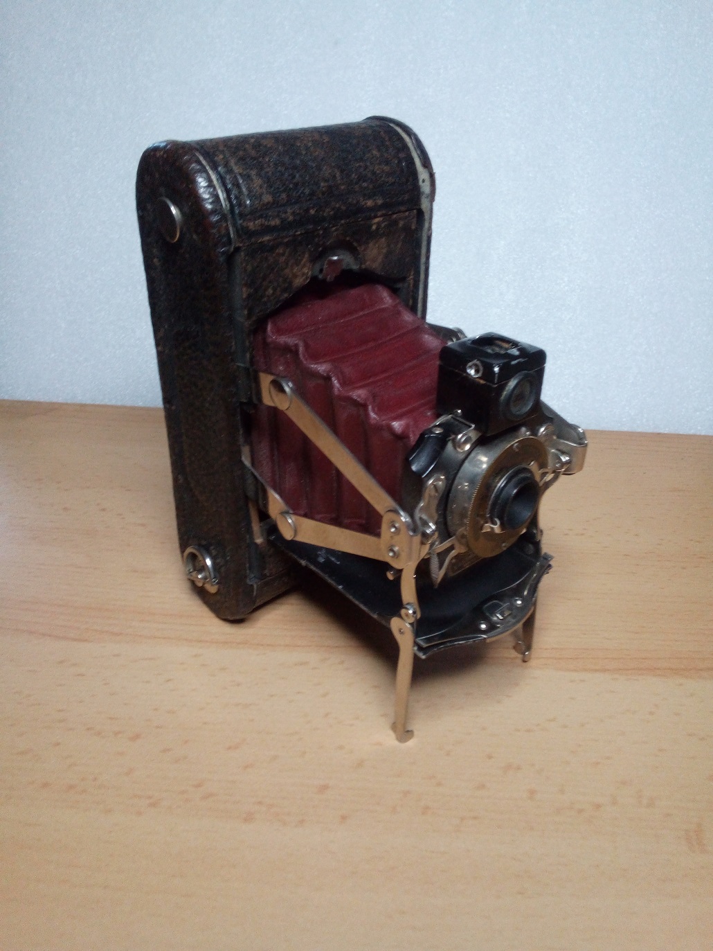 Aus der Sammlung meiner Tochter darf ich heute diese Eastman Kodak No. 1 Folding Pocket "Model D" Kamera vorstellen. Laut Internetrecherche wurde das "Model D" von Juli 1906 bis April 1915 gefertigt. Da ab 1912 nur noch schwarze Balgen verbaut worden sein sollen, lässt sich das Baujahr der gezeigten Kamera mit einem roten Balgen auf Juli 1906 bis 1912 eingrenzen.
