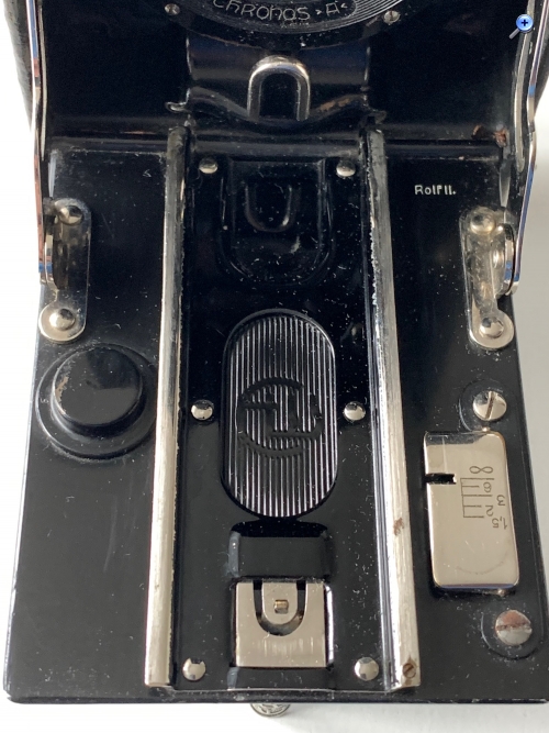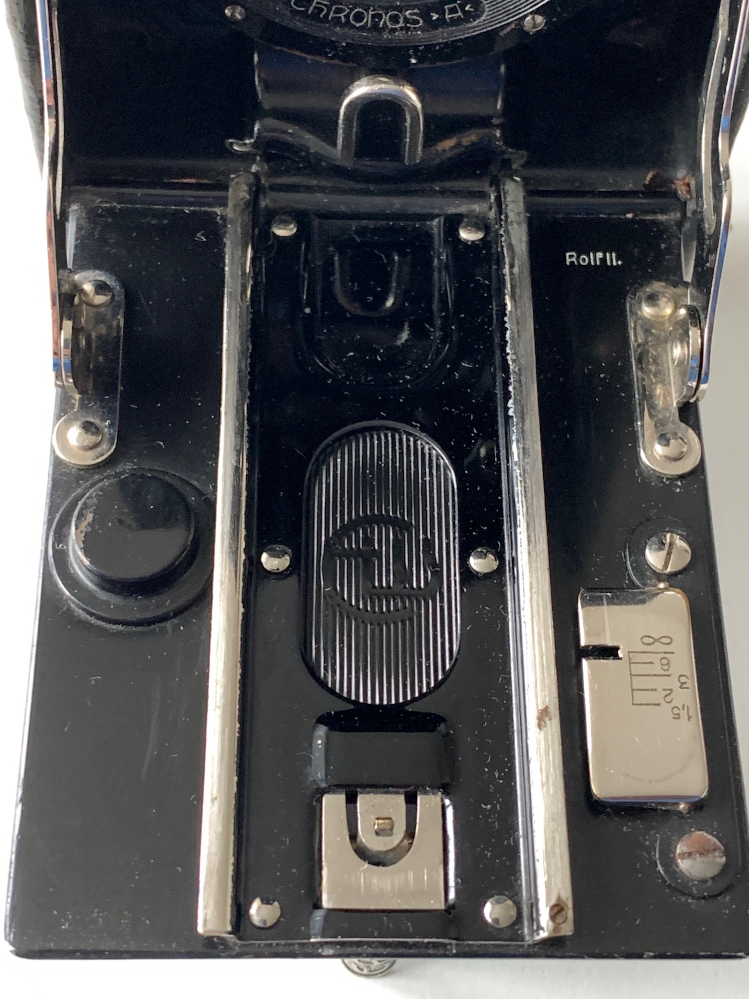 Man beachte Warenzeichen und Schreibweise: Chronos (mit <h>) hießen die Verschlüsse lt. Göllner (1995, S. 232) bis 1925, im letzten Jahr wurde die Schreibweise in Cronos geändert. Das EW-Signet (Ernemann-Werke) im Laufboden wurde in der Zeit um 1921 gebraucht (vgl. Göllner 1995, S. 172); evtl. wurden Gehäuseteile von der Rolf I für dieses Modell weiterverwendet.