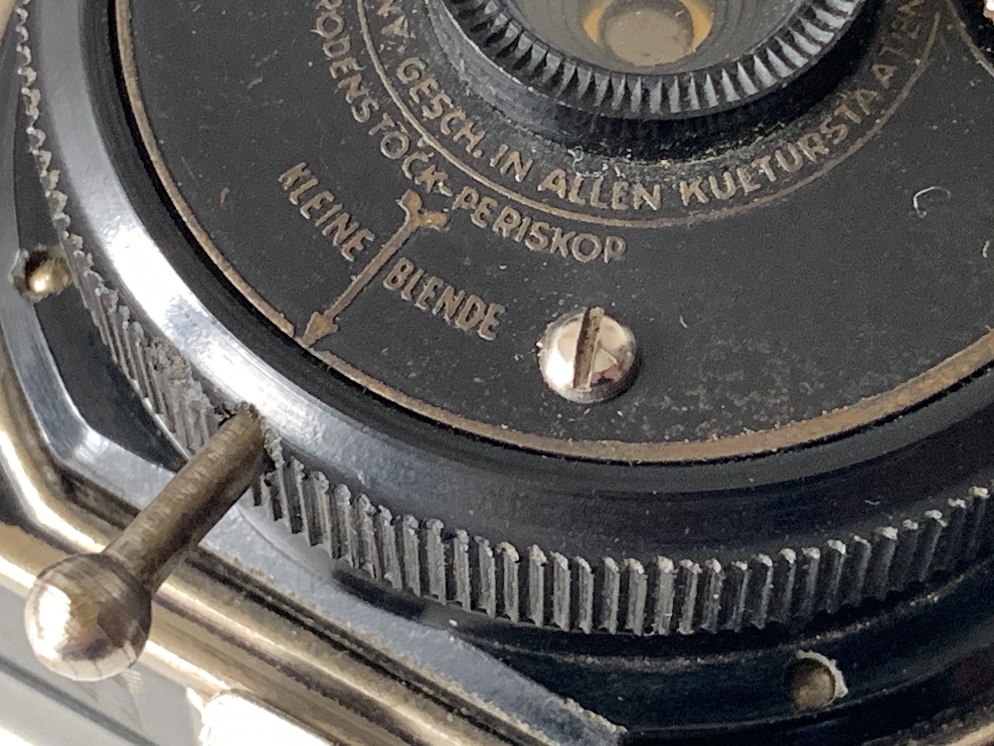 Das Objektiv ist ein Rodenstock Periskop 1:11 in einem Einfachverschluss (eine Momentzeit und Z). Eingebaut ist eine Lochblende, die über einen herausziehbaren Stift gesteuert wird. Eine Entfernungseinstellung ist nicht erforderlich.