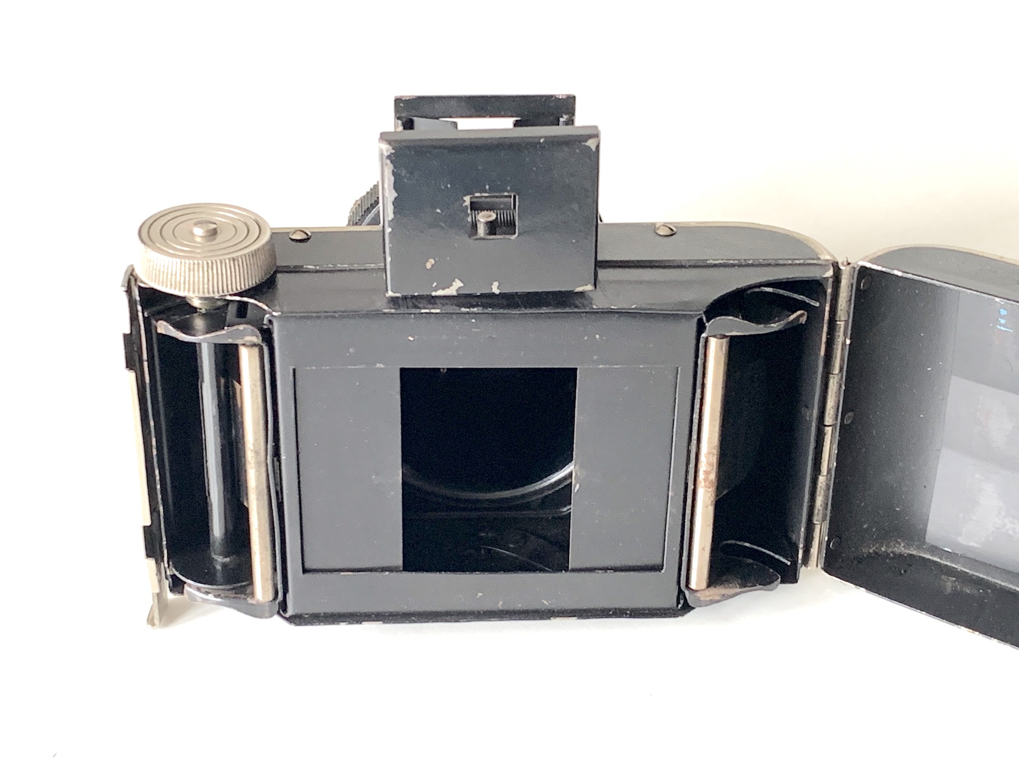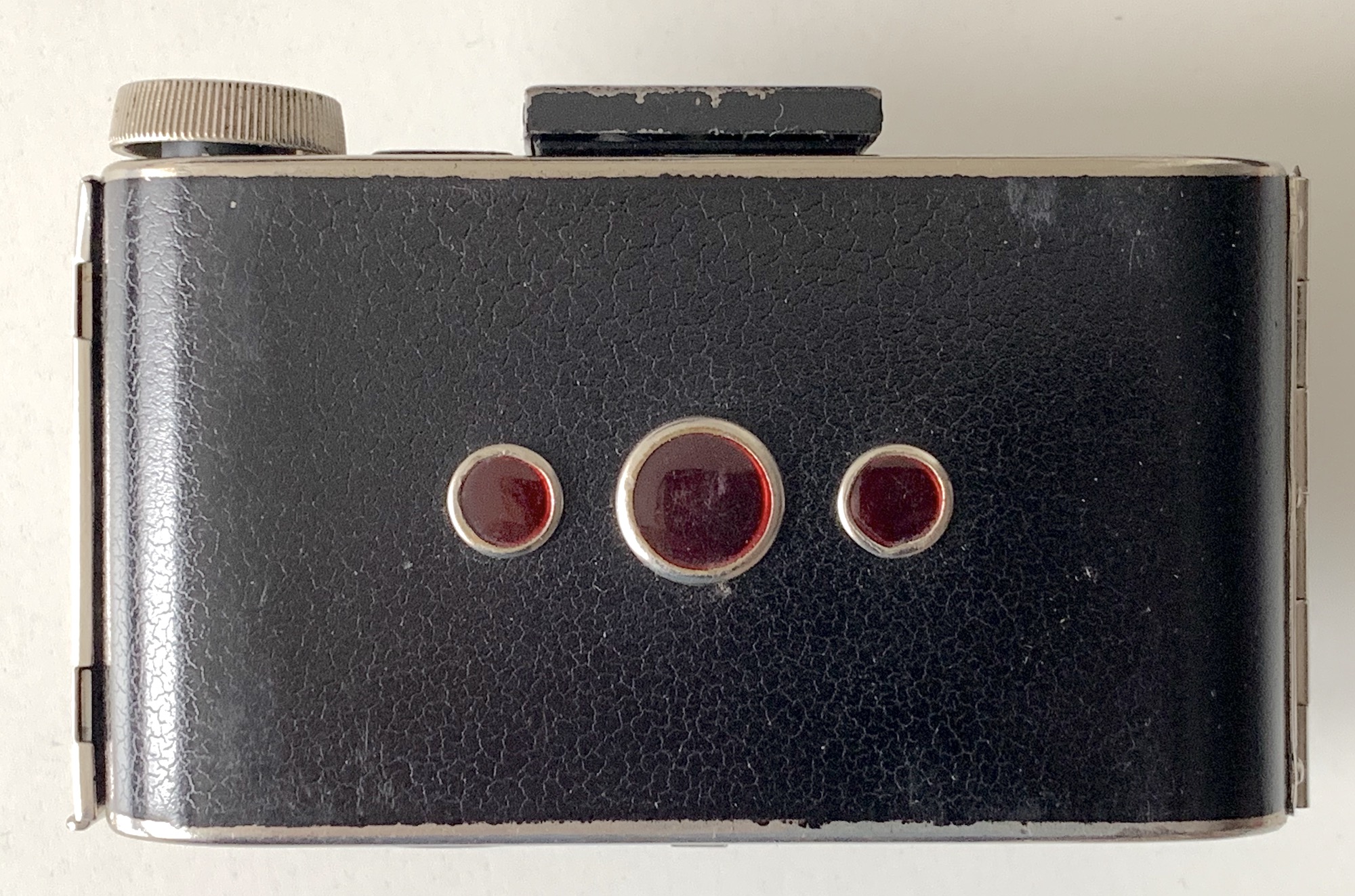 Die Kamera ist als Tubuskamera ausgeführt. Der aus Kunststoff (ich bin mir nicht sicher, ob es Bakelit ist) bestehende Tubus besitzt ein Gewinde; wenn er vollständig herausgedreht ist, klappt der Rahmensucher auf. Das Gehäuse selbst besteht aus Blech.