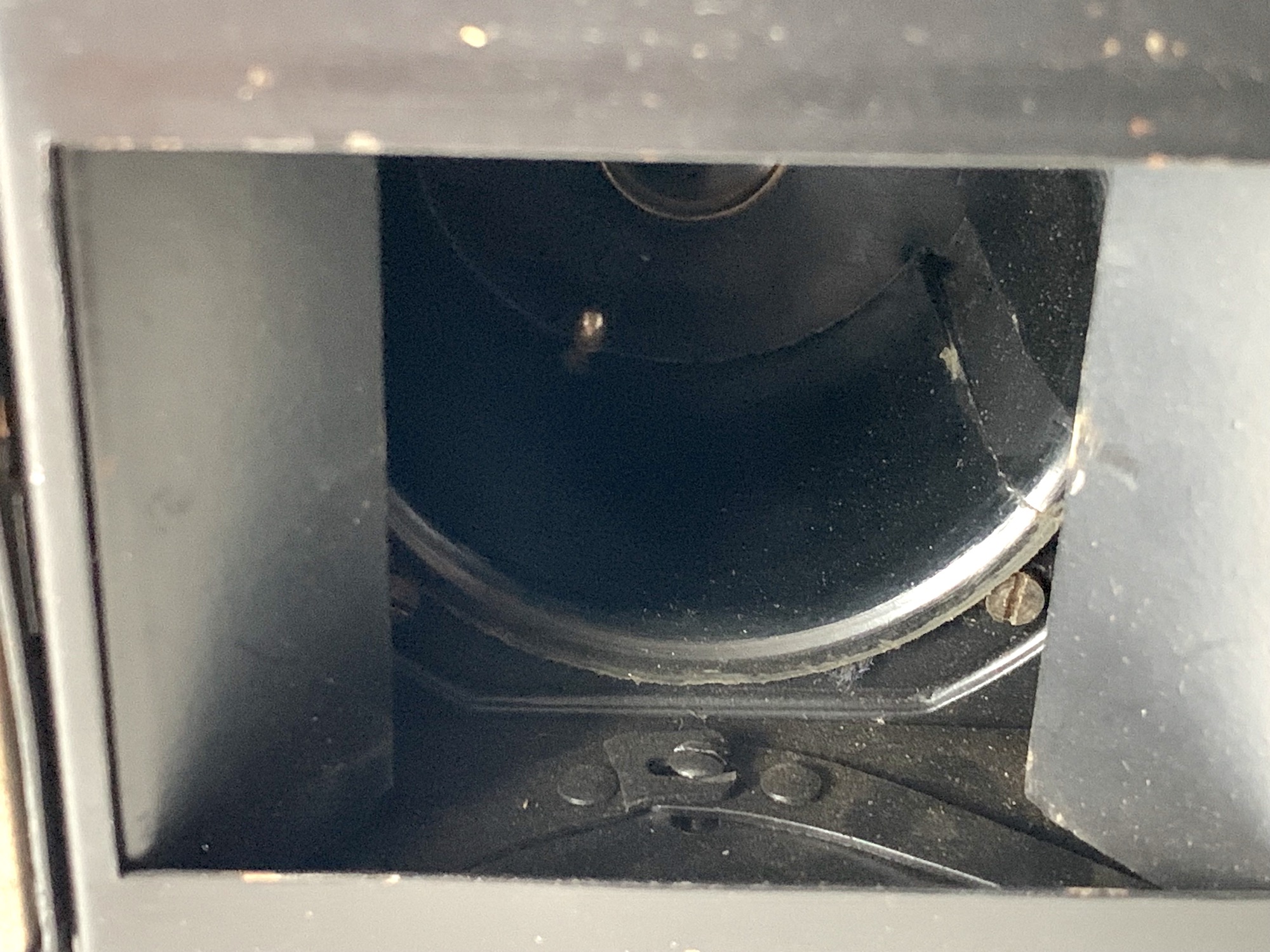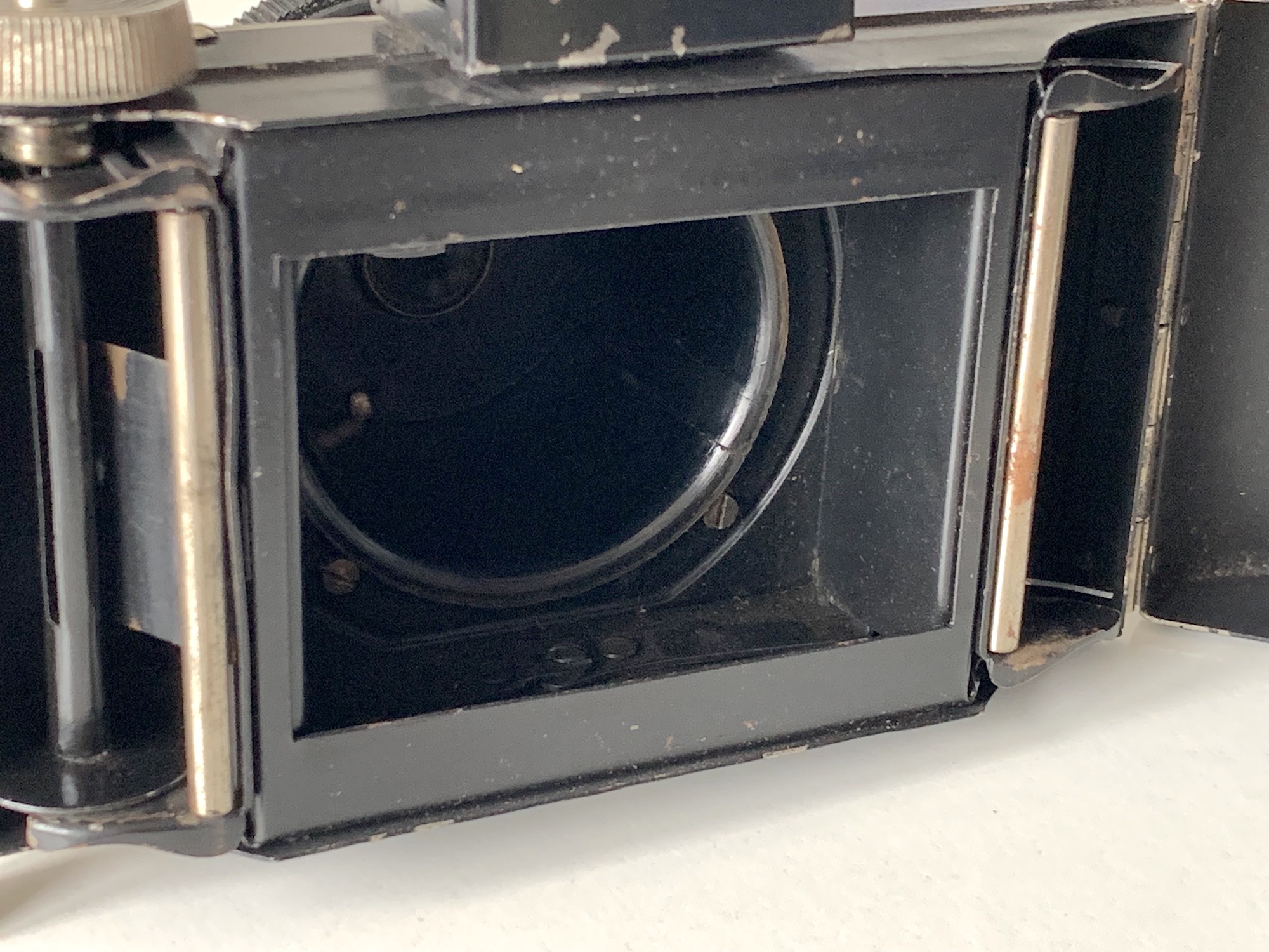 Der Witz ist ja, dass das hier mit den beiden Blechen eigentlich ziemlich simpel gestaltet ist; von technischem Aufwand kann gar keine Rede sein. Vielleicht war das System ja auch nicht richtig zuverlässig, ich weiß es nicht. Aber selbst bei deutlich teureren Kameras hat man eigentlich immer diese Formatmasken verwendet, die oftmals verloren sind. Und auch das waren nicht selten ziemlich billige Bleche.