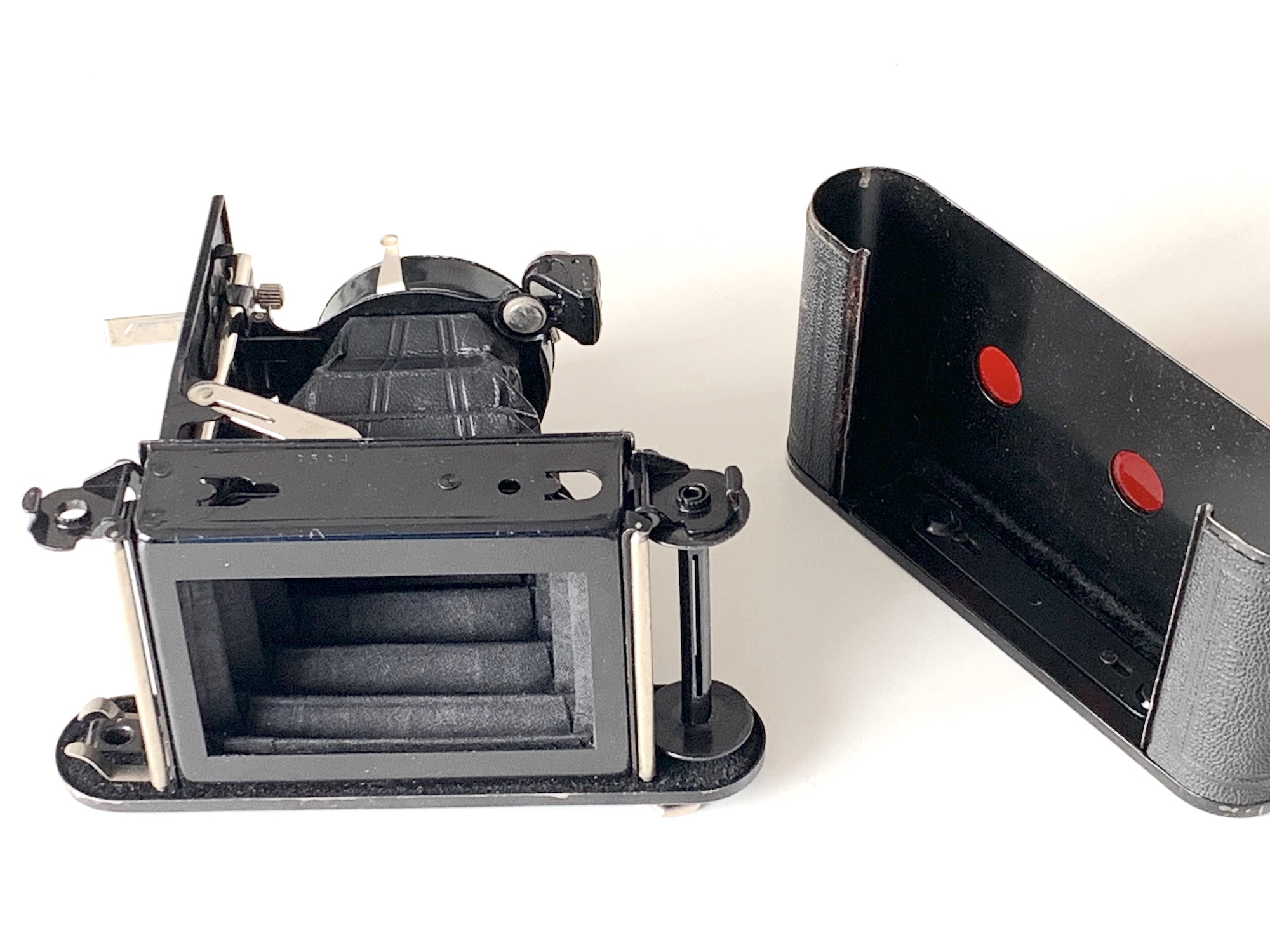 Die Kamera gehört m.E. in eine 3x4-Sammlung; leistungsmäßig ist sie wohl mit der Baby-Box vergleichbar, aber als Westentaschenkamera ausgelegt (Maße: 12 x 6,5 x 2,5 cm). – Verbaut ist ein Frontar 9/8 cm, es können die Blenden 9, 16 und 32 eingestellt werden. Der Verschluss liefert eine Momentzeit (1/25) und B. Es gibt auch eine rudimentäre Entfernungsskala mit Marken für ∞ und 2 m. Als Sucher fungiert eine umlegbarer Brillantsucher. Ein Stativanschluss ist nicht vorhanden.