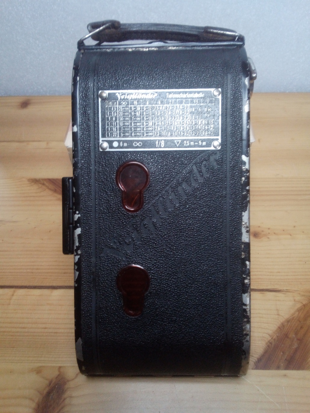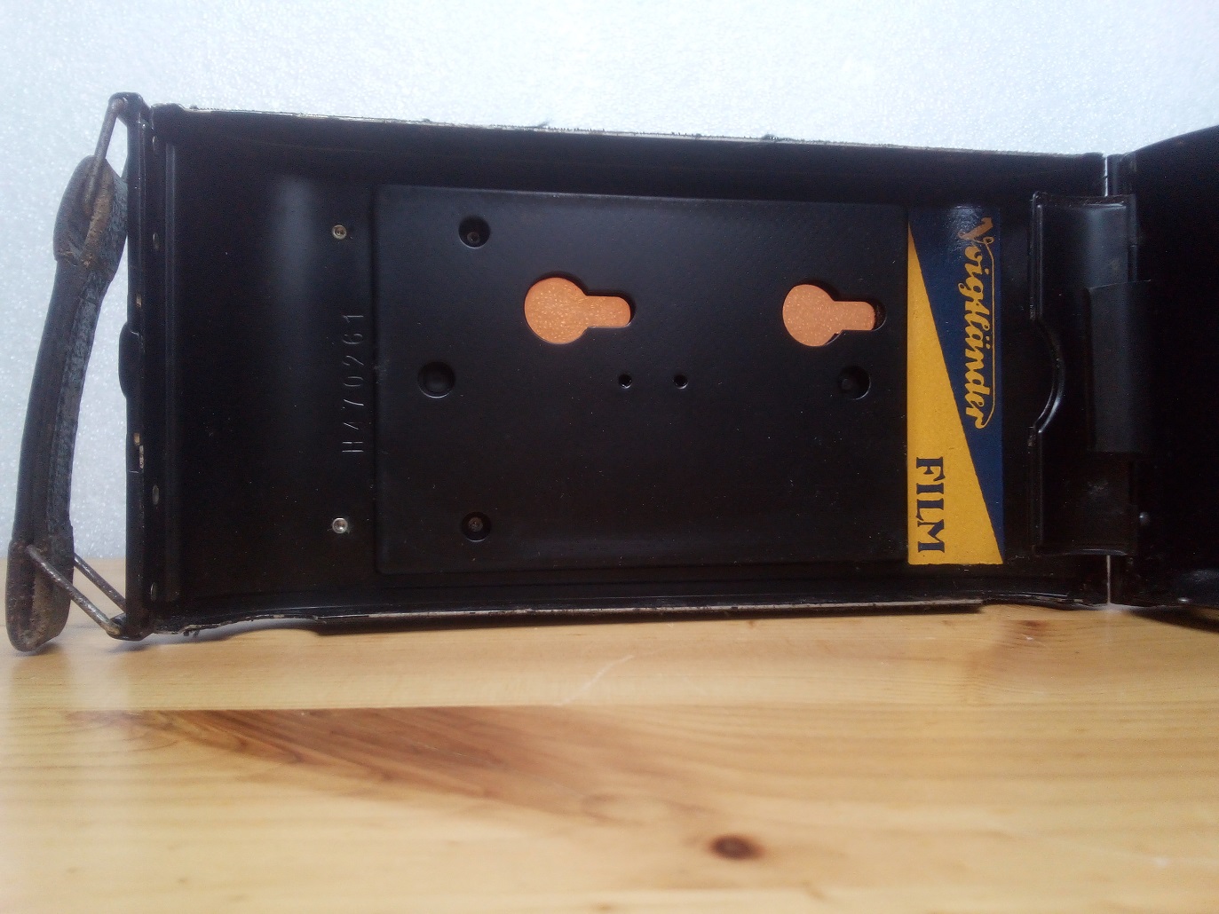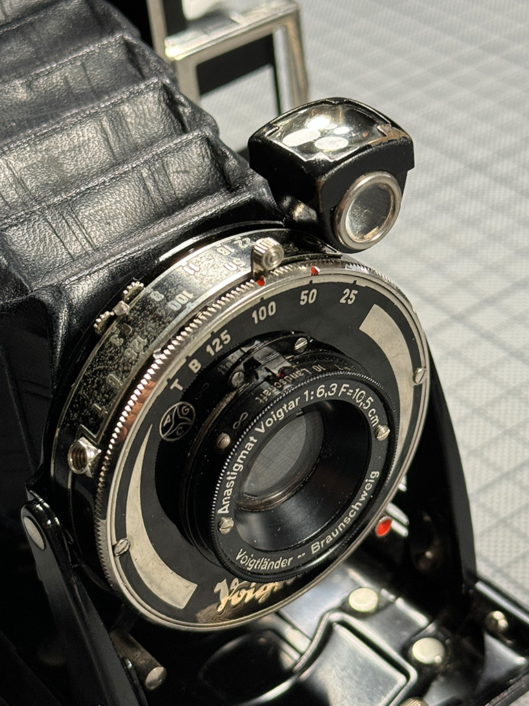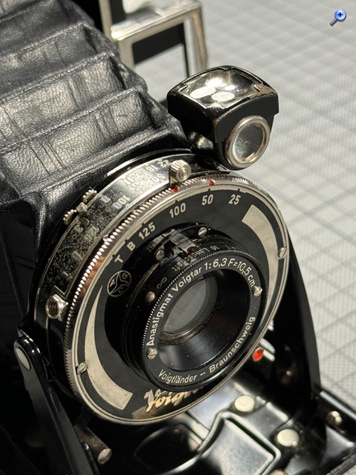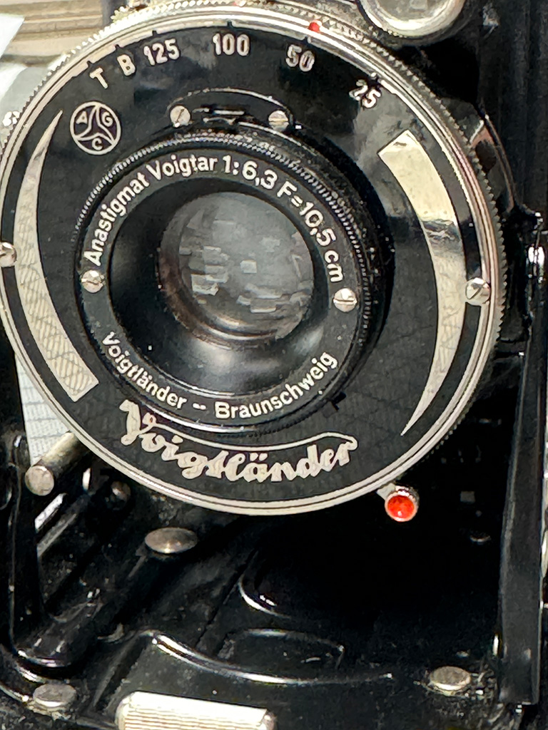Die hier gezeigte Kamera mit dem schwarzen Sucher und den schwarzen Umrandungen soll ab 1937 in den Handel gekommen sein. Leider bin ich bei meiner Suche über die Seriennummer des Gehäuses nicht weitergekommen. Eine Bestimmung des Baujahres über den Anfangsbuchstaben, wie z. B. bei der AVUS, habe ich nicht finden können. Wenn ein Voigtländer Experte mir da evtl. weiterhelfen könnte? Die Seriennummer ist gleich weiter unten bei den technischen Daten zu finden.