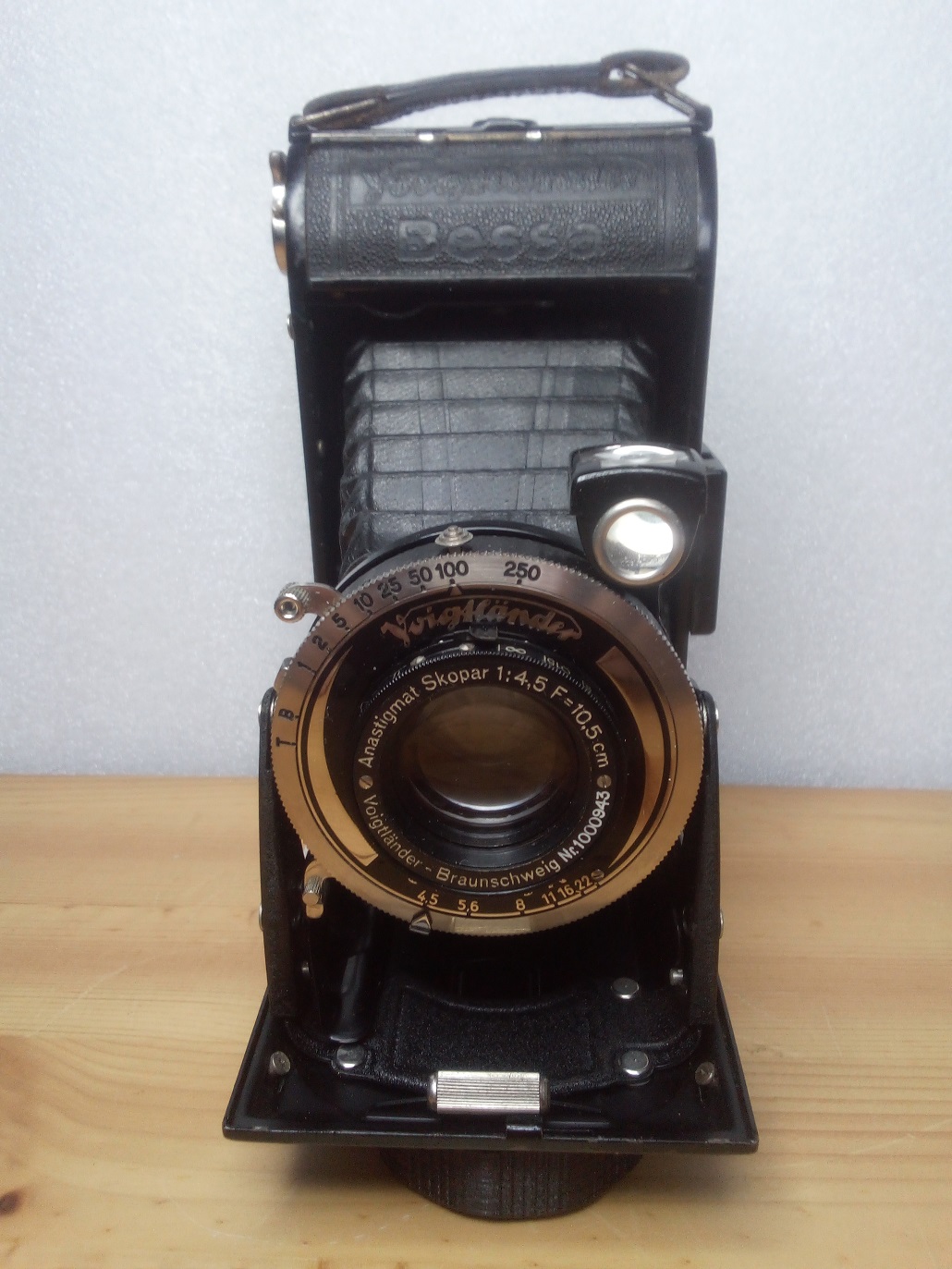 Hersteller: Voigtländer, Braunschweig Modell: Bessa (Modell 4) Seriennummer:H470261 Baujahr: ab 1935 (schwarze Ausführung ab 1937?) Typ: Zweiformat (4,5 x 6 und 6x 9) Rollfillm (120) Sucher-Balgenkamera, mit Rahmen- und Brilliantsucher Verschluß: COMPUR, "T", "B", 1 - 1/250 sec. mit Vorspannhebel, Seriennummer: 3166355 Blenden: 4,5 - 22 Objektiv: Voigtländer-Braunschweig Anastigmat Skopar 1:4,5 / 10,5 cm, Nr. 1000943 Fokus: manuell, 1m - unendlich