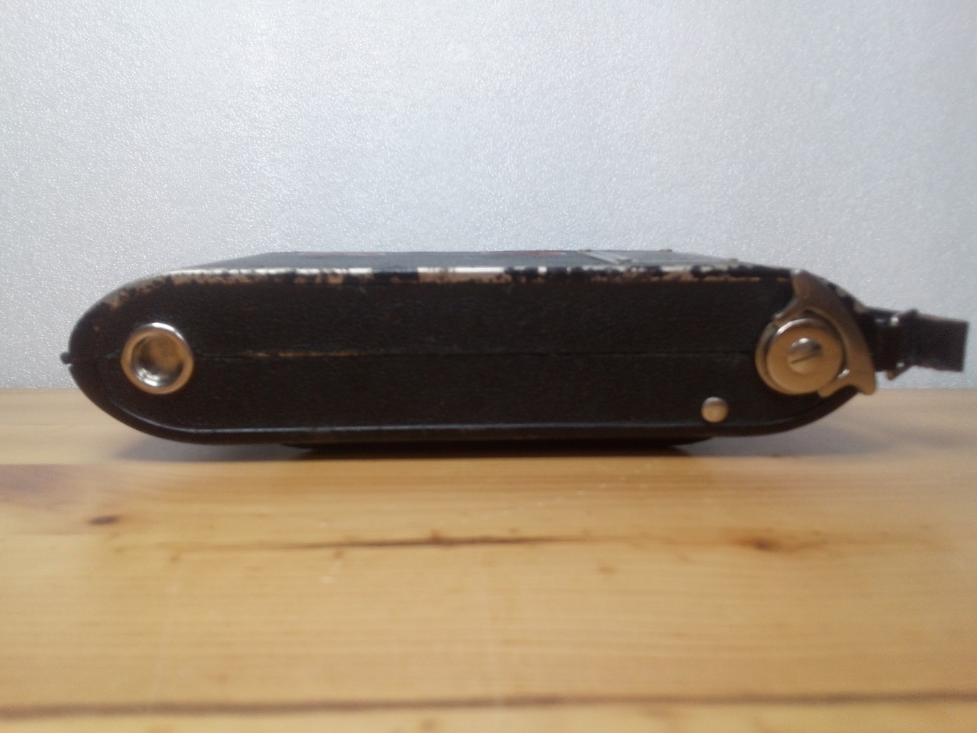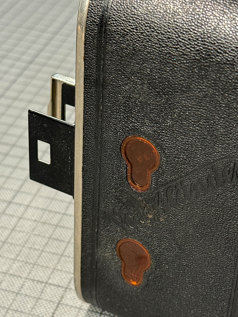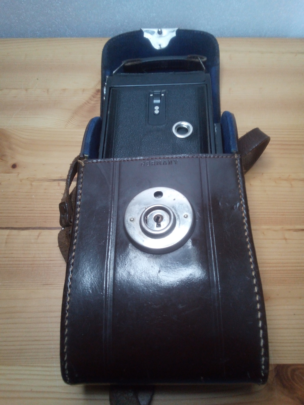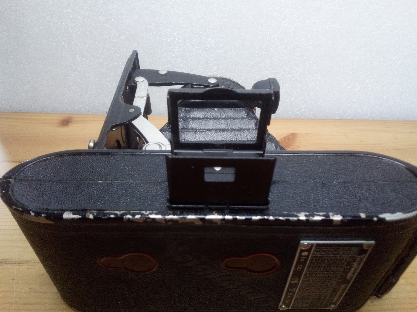 Rückseite: klappbarer Kameradeckel mit zwei nicht verschließbaren Rotfenstern, aufgenietete Tiefenschärfetabelle