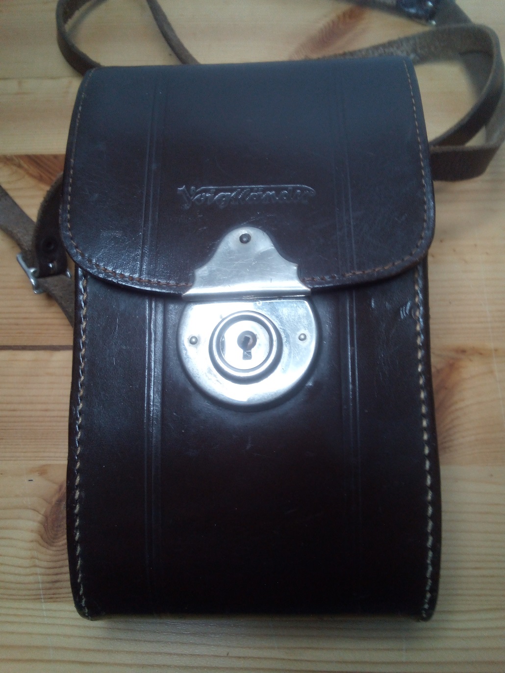 Zubehör: Echtledertasche mit dunkelblauem Samtfutter und Prägung "Voigtländer"