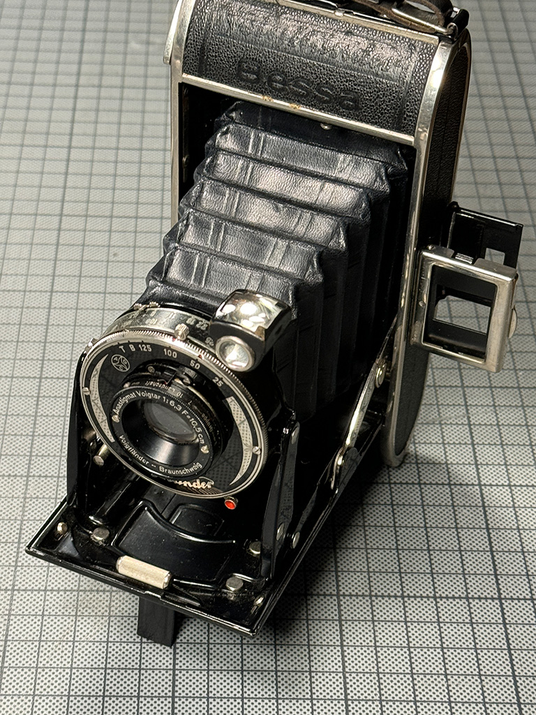nur zur Ergänzung: Bei Prochnow (Voigtländer-Report 3) ist diese Kamera – in der Bestückung mit Skopar 4,5 in normalem Compur – als PR 3778/7 gelistet. Als Zeitraum gibt er 1935–37 an; genaueren Aufschluss soll der Buchstabe vor der Seriennummer (Innenseite Rückwand) liefern (G: 1935; H: 1936; J: 1937). Auch Prochnow nennt die schwarze Lackierung der Randleisten als Merkmal später Exemplare. Auf die walzenförmige Schließtaste bei einigen Exemplaren weist er auch hin. Als Verkaufspreis für die von Andreas gezeigte Ausführung gibt er 75 RM an. Prochnow bezeichnet die Kamera übrigens als "Bessa Zweiformat, Erstes Modell".