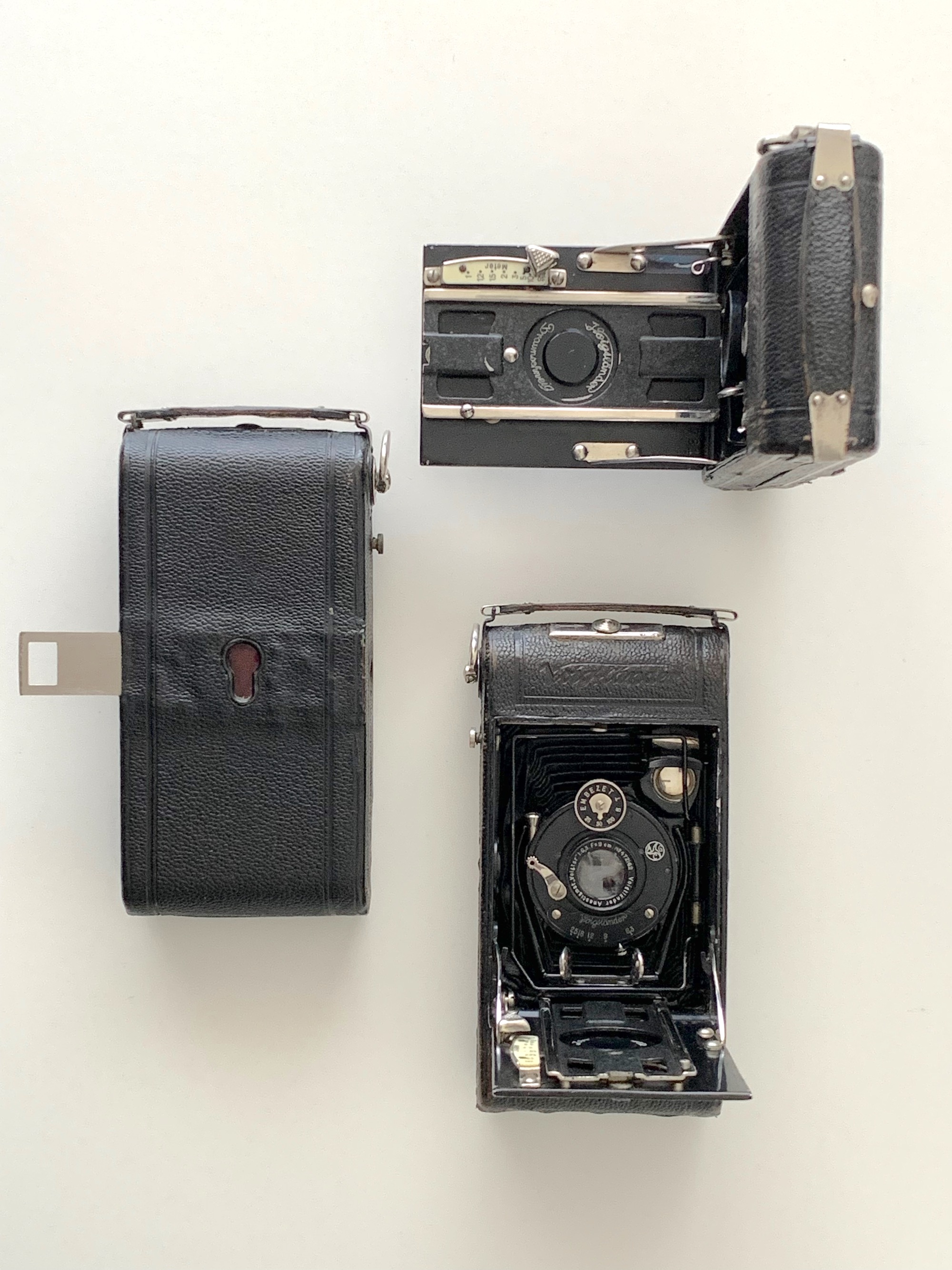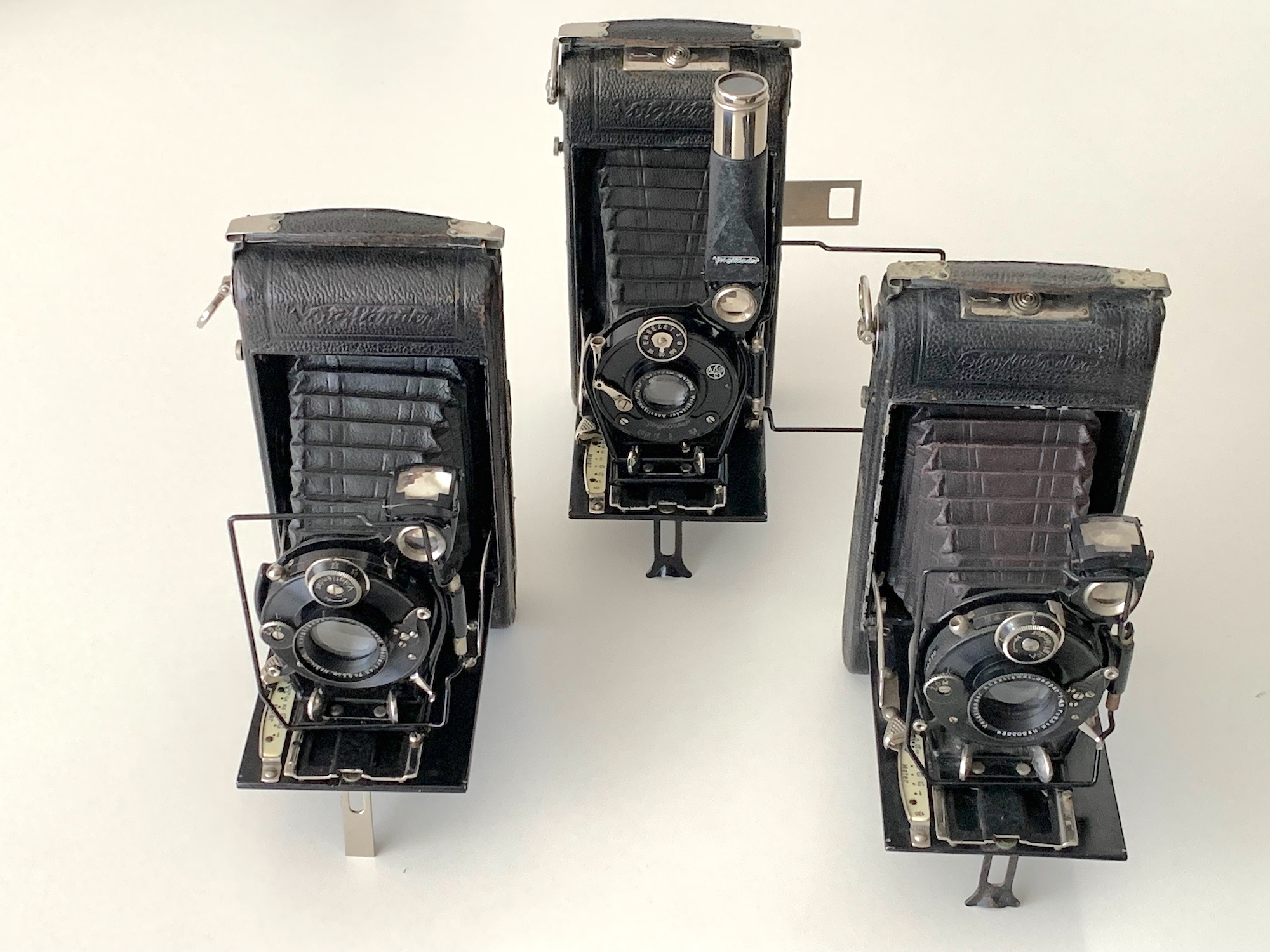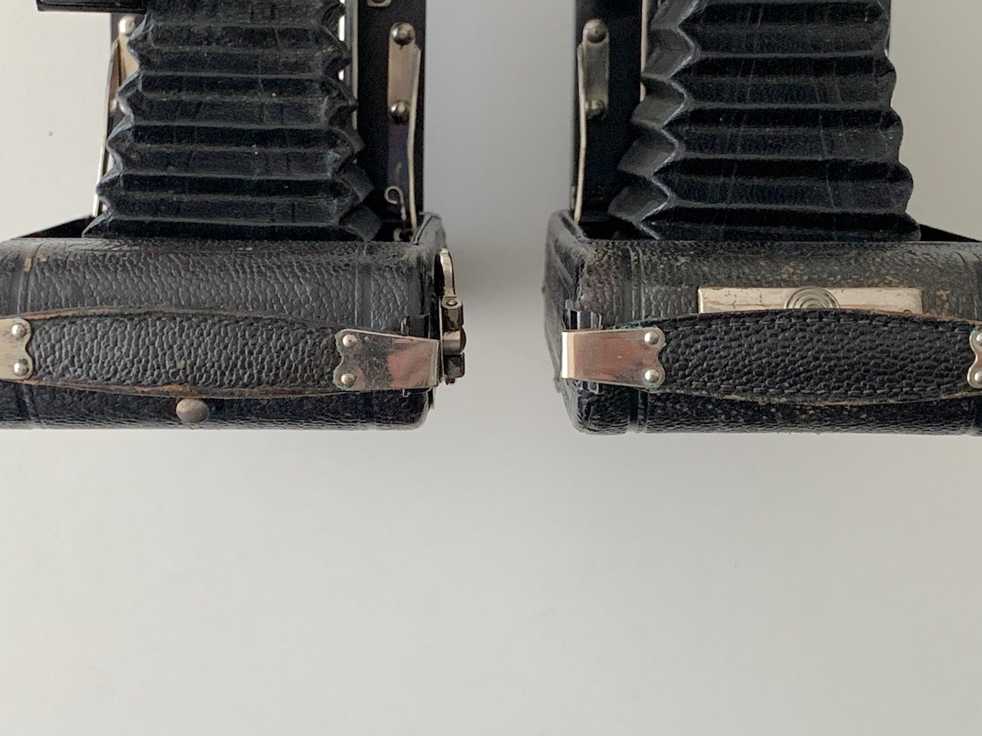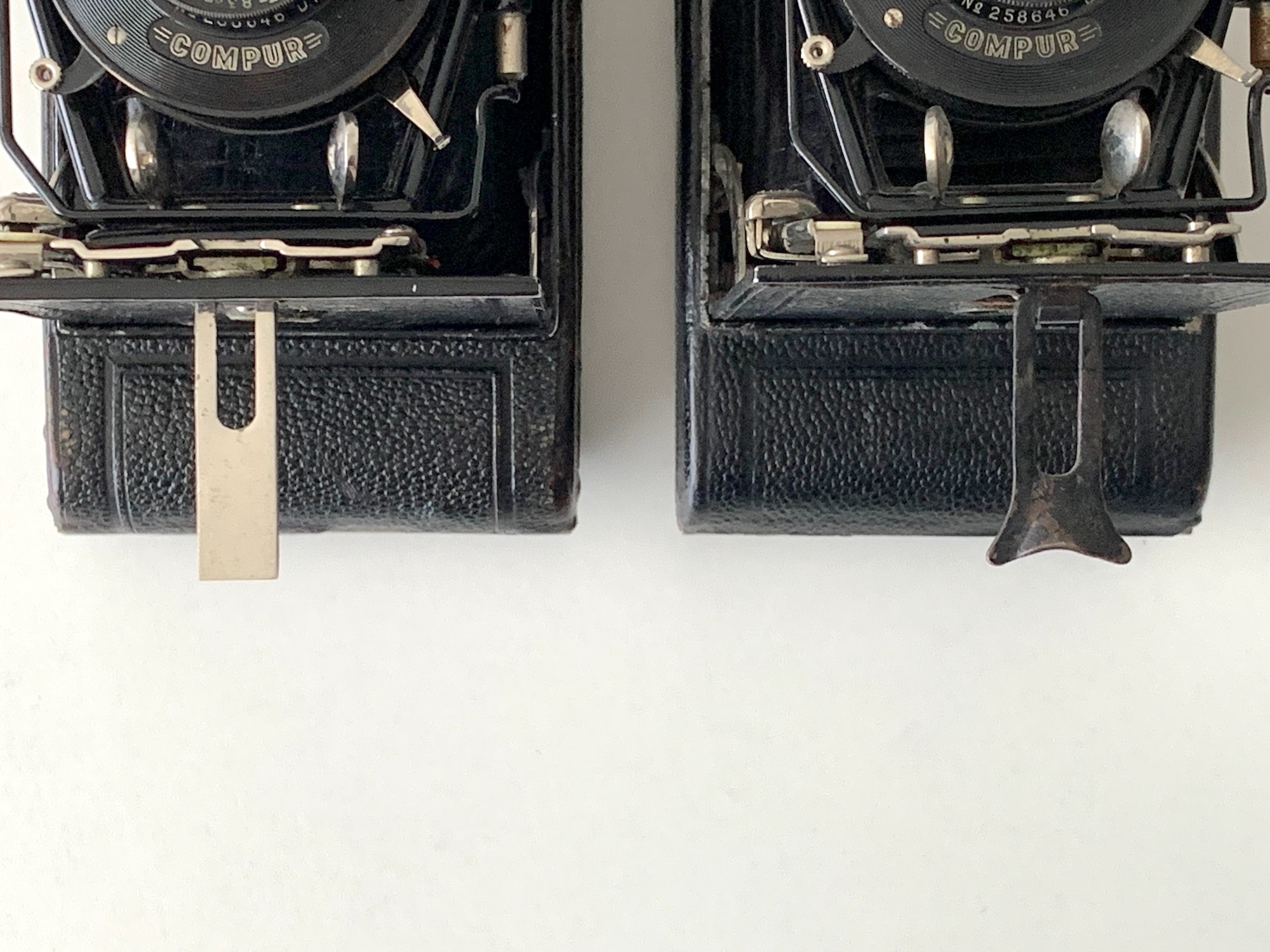 Die gezeigten Exemplare unterscheiden sich aber nicht nur in der Bestückung: Die ersten Kameras besaßen einen etwas fragilen blanken Aufstellfuß; um 1929 wurde eine solidere Konstruktion mit schwarzem Aufsteller eingeführt.