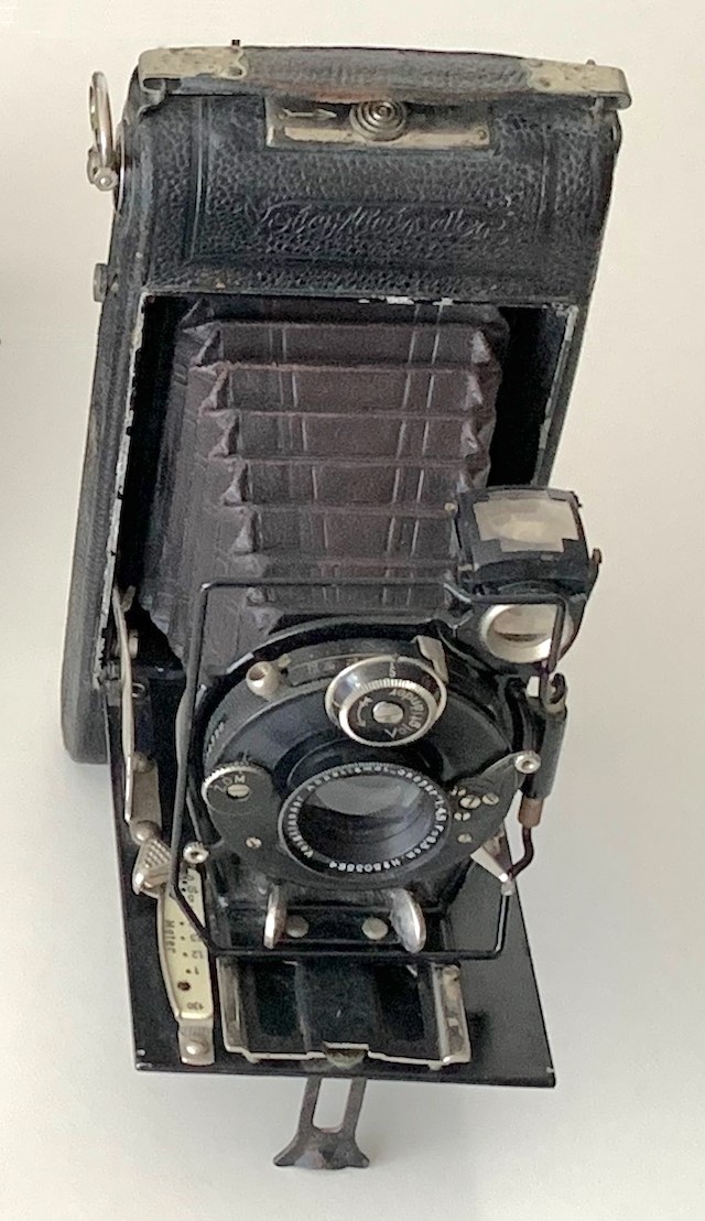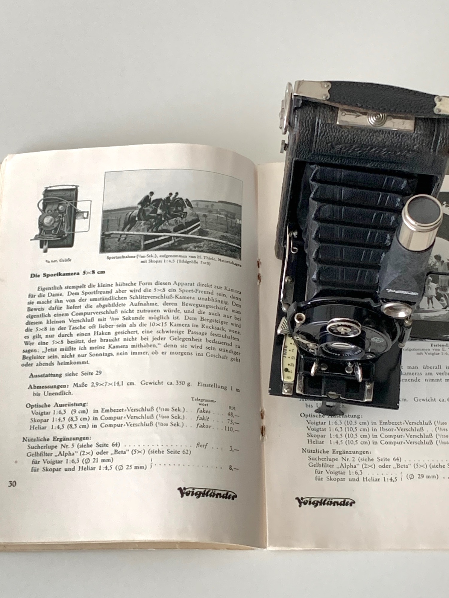 Mein Exemplar ist mit dem Skopar 4,5/8 im Compur ausgestattet. Die Kamera besitzt noch den älteren blanken Aufstellfuß, der im 1929er Katalog abgebildet ist. Der Rückwandverschluss weist bereits die modernere Form auf, wie sie im 1930er Katalog zu finden ist.