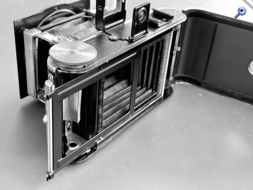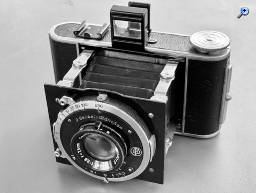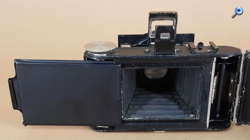 Der Sucher der Kamera ist mit dem Auszug der Objektivplatte gekoppelt. Er klappt automatisch auf, wenn das Vorderteil in Aufnahmestellung zieht. In dieser Ausstattung kostete die Kamera 1935 bei Photo Porst 92 RM.