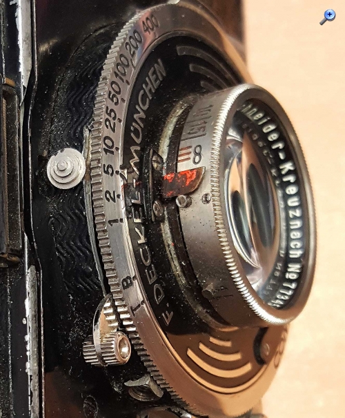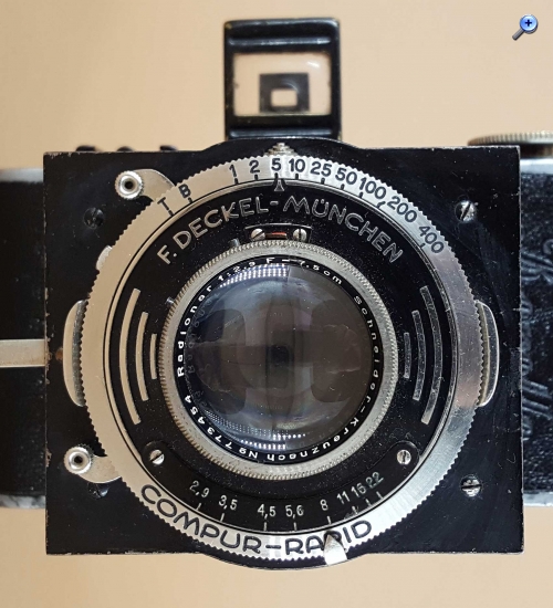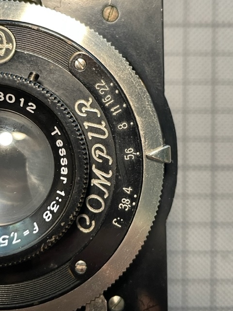 Das vorliegende Exemplar ist mit einem Schneider-Kreuznach Radionar 2.9/7,5 ganz ordentlich ausgestattet und kann mit Hilfe der Seriennummer des Objektivs auf 1935 datiert werden. Als Verschluss ist ein Compur-Rapid verbaut, der für einen Aufpreis von 10 RM angeboten wurde. Objektiv und Verschluss sind beim Transport durch eine passende Blechkappe geschützt.