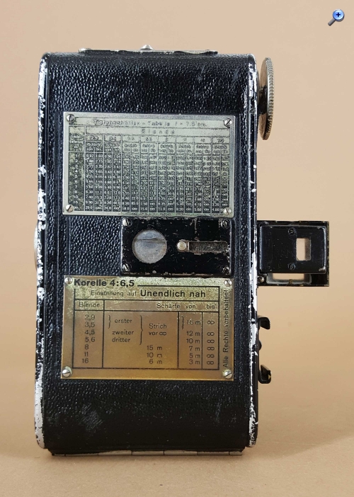 Auf der Rückwand befindet sich neben der üblichen Tiefenschärfentabelle noch eine Tabelle für die Einstellung auf „Unendlich nah“. Kochmann warb auch mit dieser vorteilhaften Einstellmöglichkeit: „Ganz neu und von größter Wichtigkeit: Einstellung auf ‚Unendlich nah‘ für alle Blenden, gegenüber der Einstellung auf oo, an meiner neuen Korelle 4x6 ½ dadurch doppelte Tiefenschärfe“. Zur praktischen Handhabung befinden sich auf der Einstellskala an der Frontlinse zwischen den den Einstellungen „15“ und „oo“ noch drei rote Striche. Je nach eingestellter Blende kann man durch Einstellung des Fokus auf den entsprechenden roten Strich den Schärfebereich nochmals erweitern.