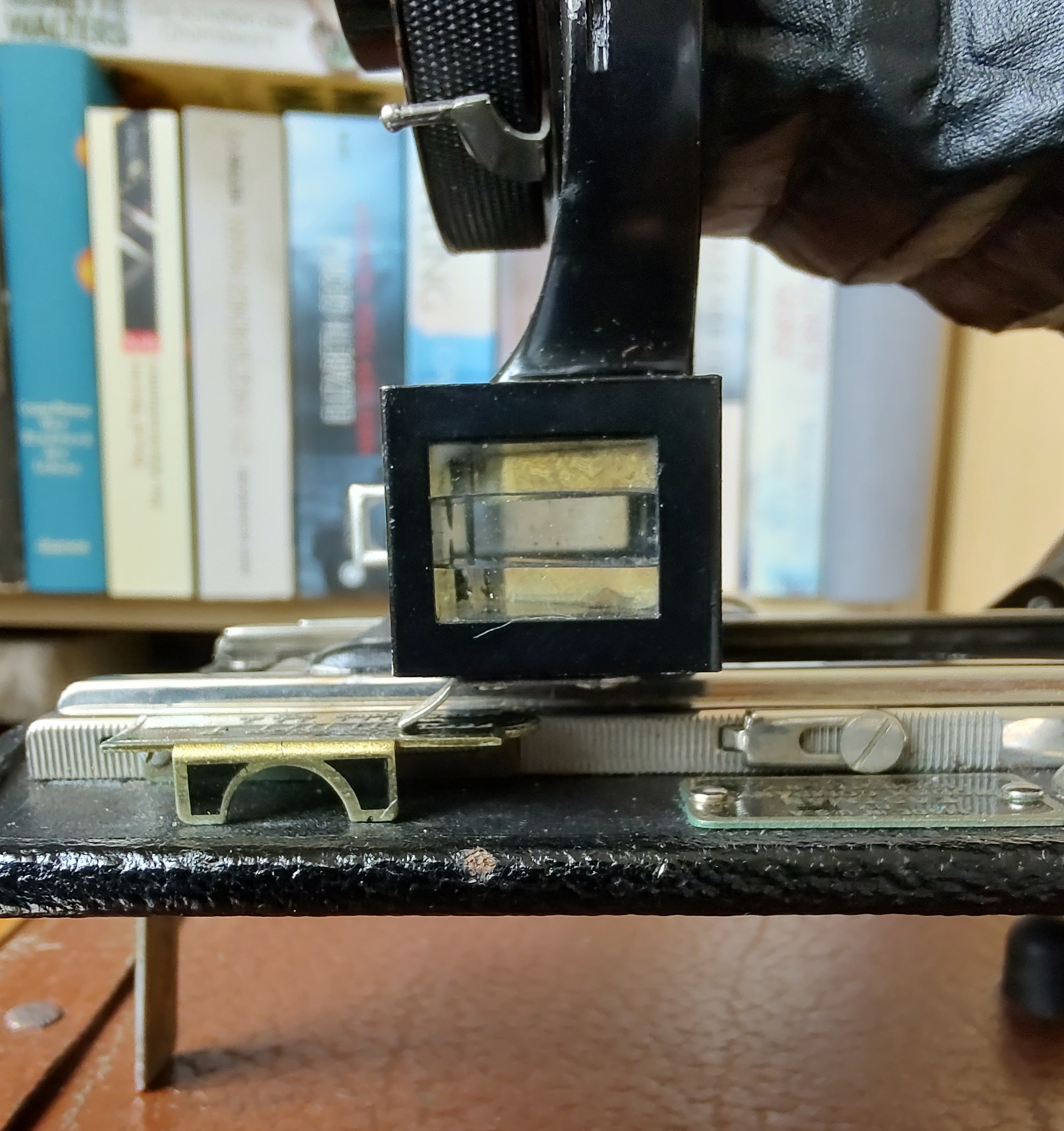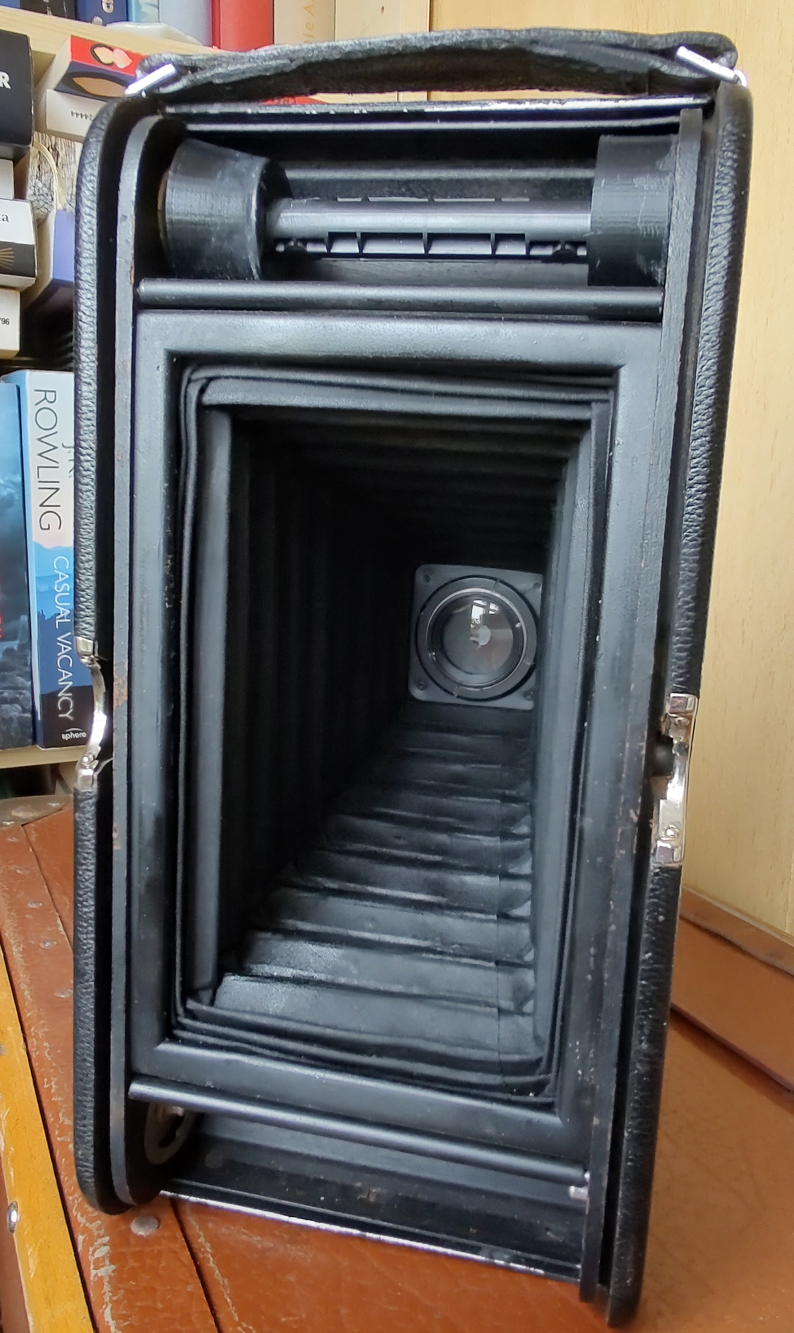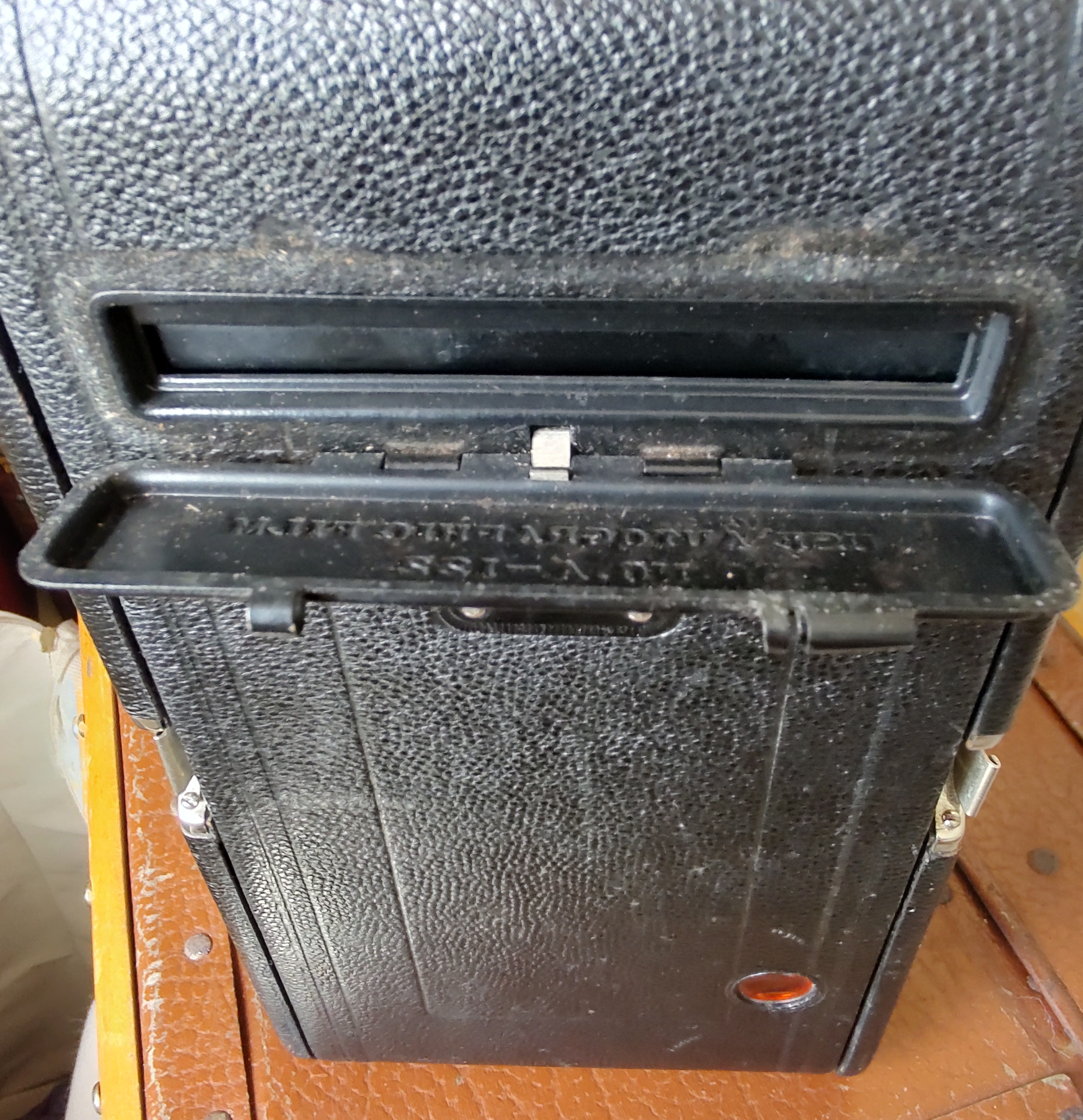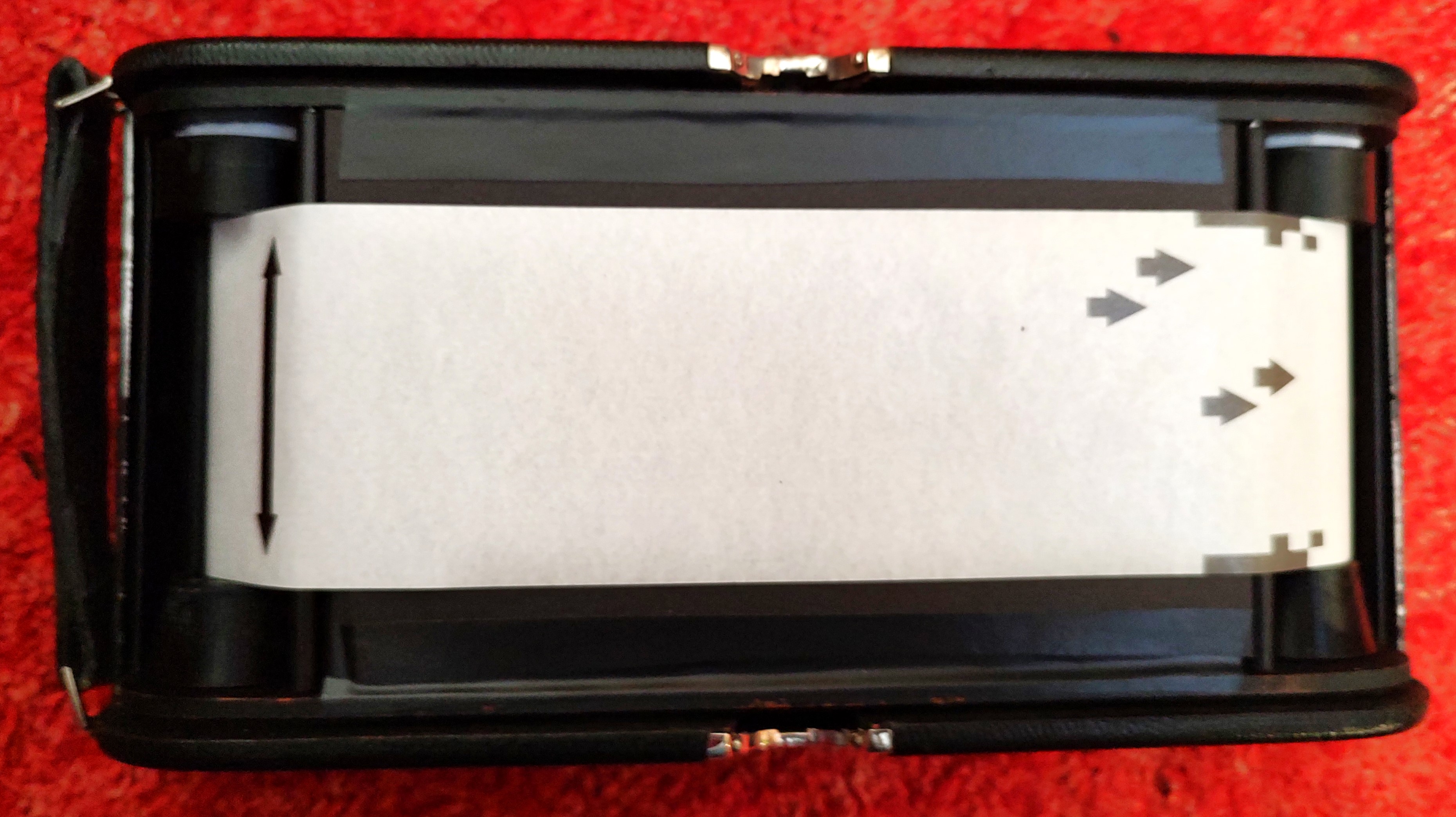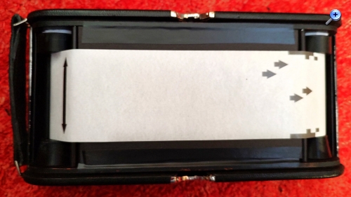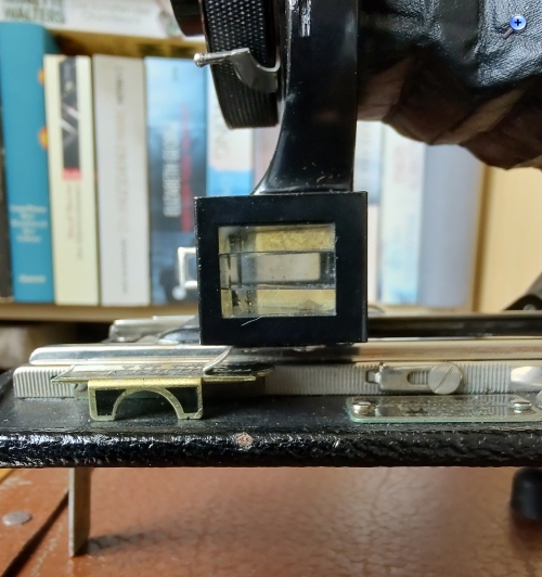 Zum Fotografieren zieht man den Balgen ganz vor, stellt dann Blende und Zeit ein und justiert die Entfernung, indem man die herausgezogene Rändelschraube am Laufboden dreht, bis der Anzeiger auf der linken Seite über der Meter/feet-Markierung steht. Ausgelöst wird dann am Objektiv. Da es keinen 122er-Film mehr gibt, muss man mit Adapterklötzchen für 120er-Film arbeiten (s. mein Foto). So bekommt man riesige randlose „Panorama-Negative“, von denen man ohne Vergrößerung Kontaktkopien machen kann. Zum Fotografieren bastle ich mit schwarzem Fotokarton zusätzlich immer noch eine Maske, damit die Spalten zwischen Film und Lichtschacht oben und unten geschlossen sind und es keine Fehlbelichtungen durch Streulicht gibt. Tückisch ist der Filmtransport: Man sieht im Rotfenster natürlich keine Bildnummern – man sieht gar nichts! Im Internet gibt es diverse Anleitungen dazu. Man muss die Umdrehungen der Filmtransport-Schraube abzählen. So bekommt man dann auf einen normalen 120er-Film ganze 4 Aufnahmen.