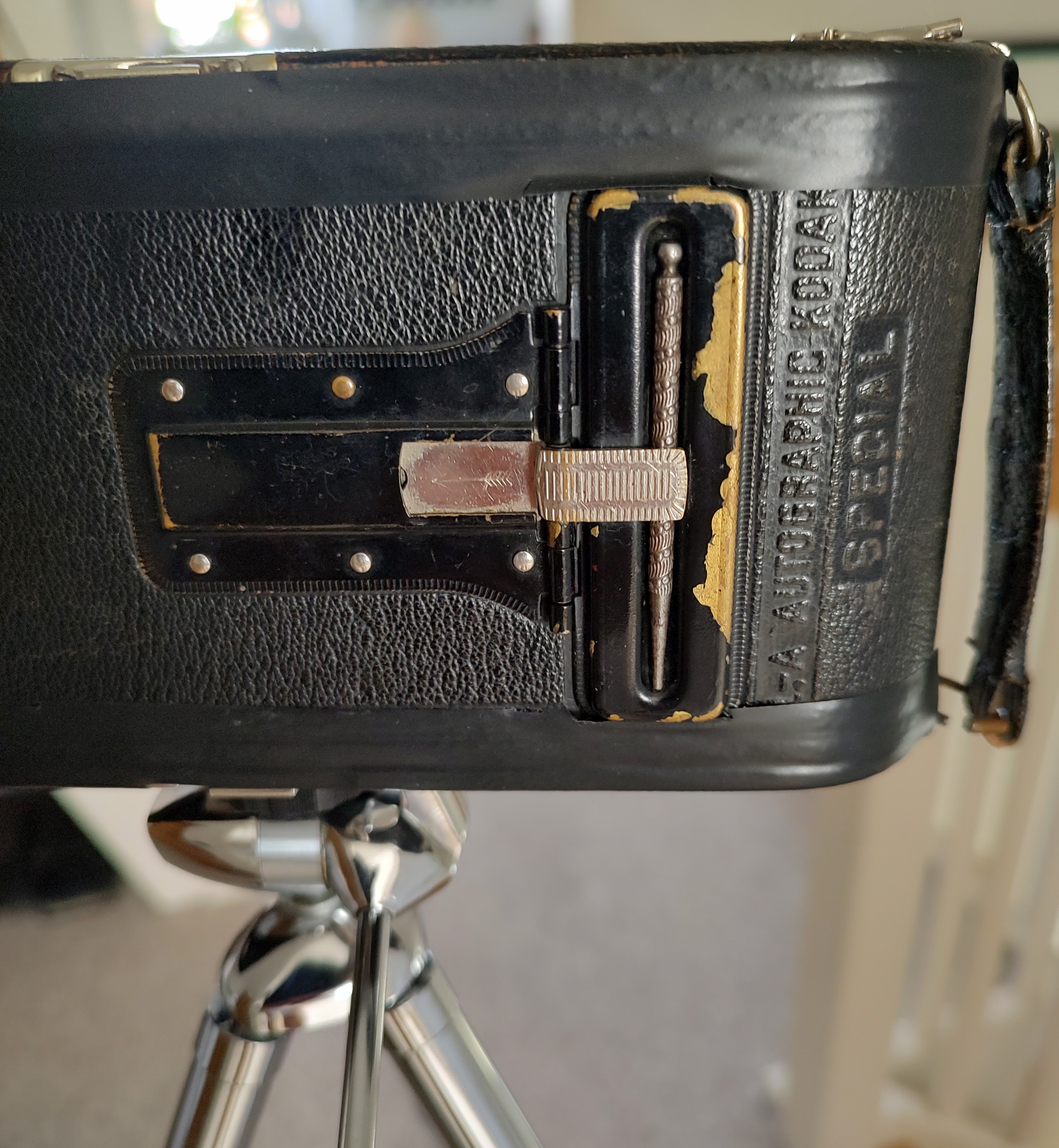 Die Kamera hat auch die von Kodak damals „gehypte“ Autographic-Funktion, mit der man mittels eines Metallstiftes durch ein aufklappbares Fenster in der Kamerarückseite Wörter auf die Rückseite des Spezialfilms schreiben konnte, die dann auf den Film durchbelichtet wurden. Eine frühe analoge Beschriftungsfunktion wie bei heutigen Digitalkameras also! Der Stift ist bei dieser 3A leider verloren, aber ich zeige das Bild meiner 1A, bei der der Autographic-Griffel noch dabei ist.