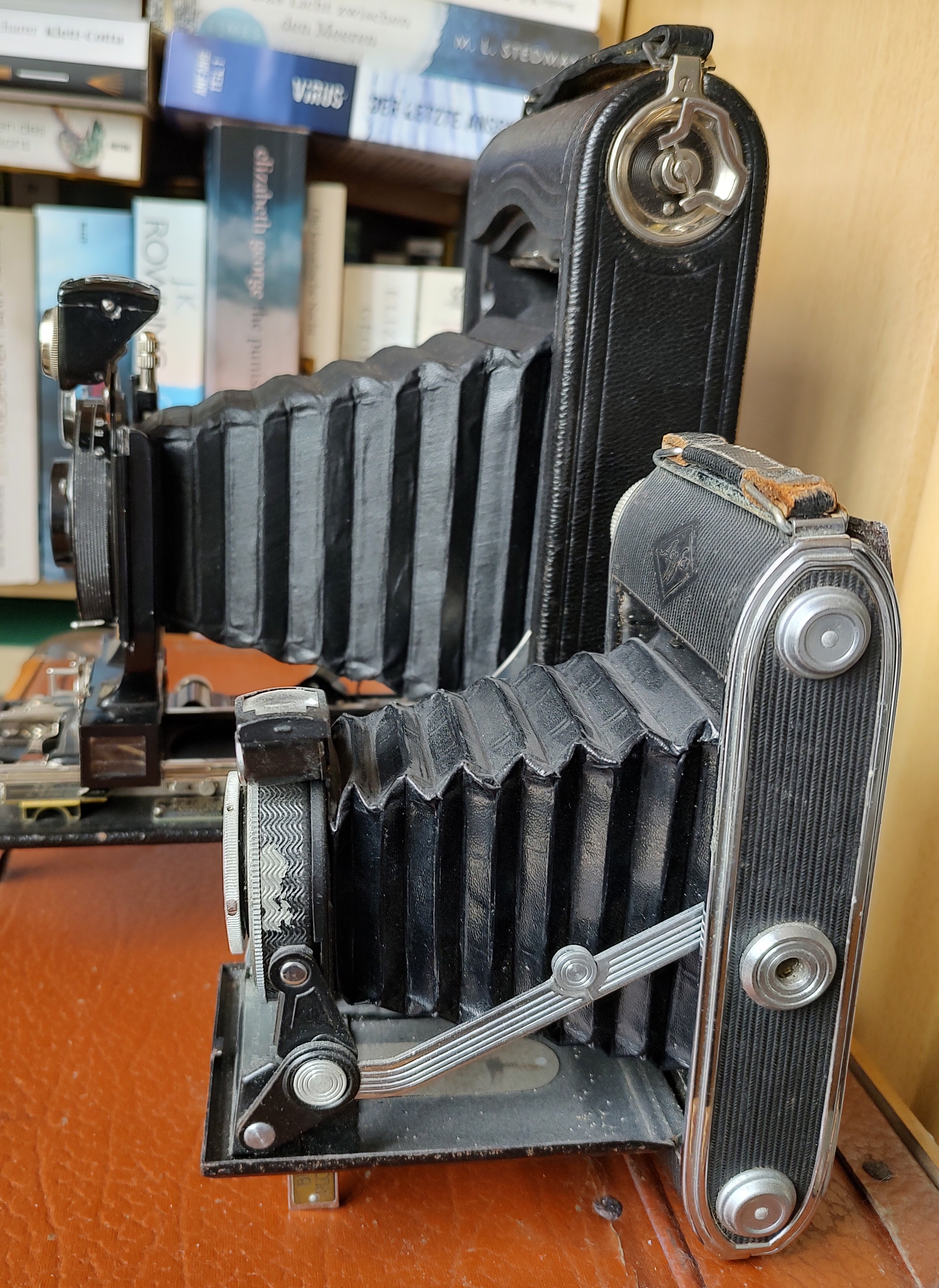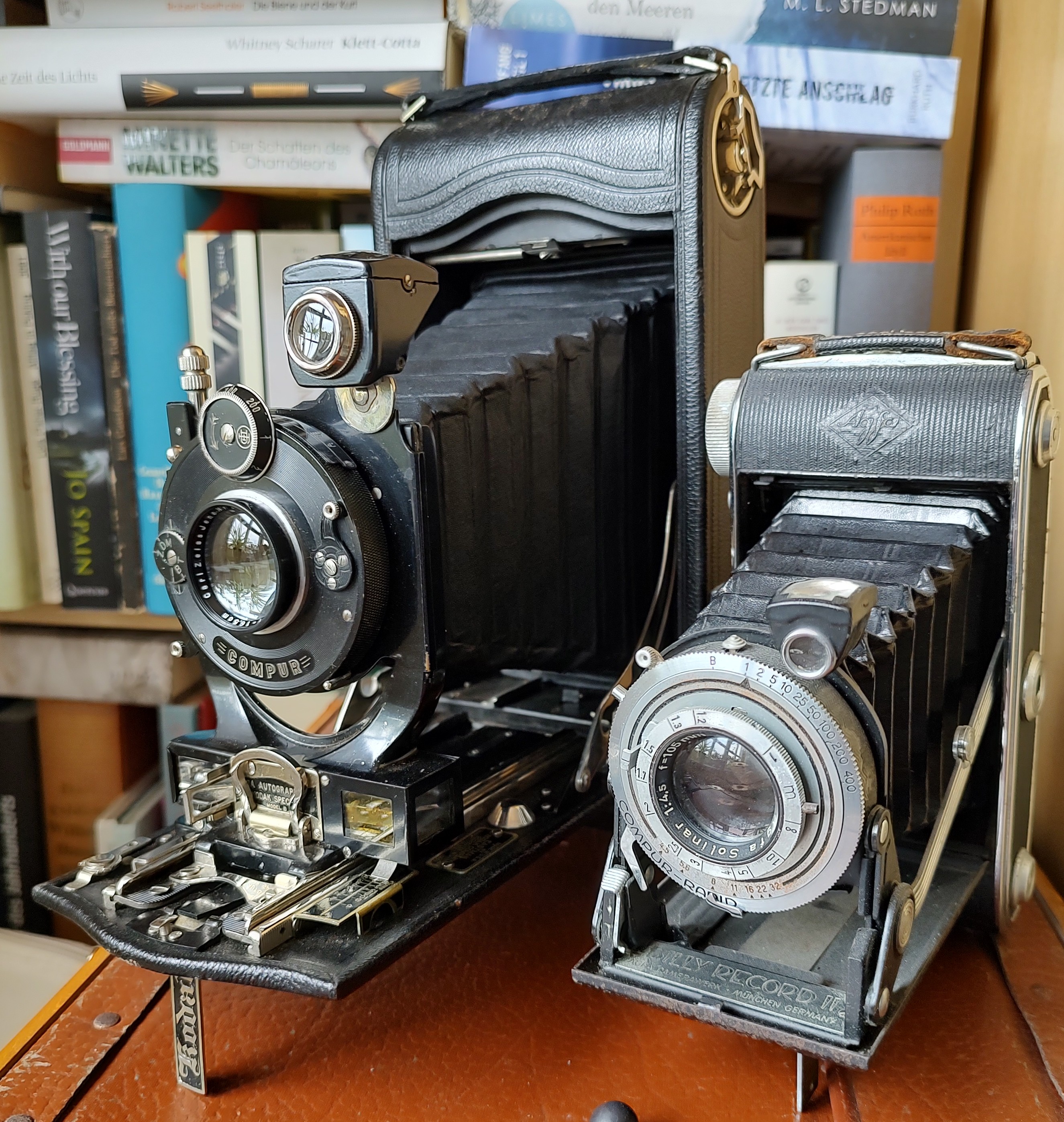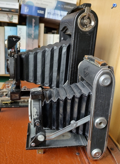 Die Kamera wurde von Kodak damals als kompakte „Taschenkamera“ angepriesen. Was für ein Klotz der schwere Apparat ist, zeigt der Vergleich mit einer Agfa Record (6x9). Beim Fotografieren verwendet man am besten ein Stativ. Auch nach 100 Jahren sind mit dieser Kamera noch scharfe und parallaxenfreie Aufnahmen möglich. Darüber staune ich selber immer wieder.