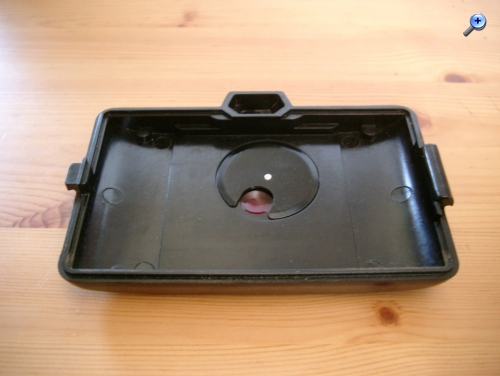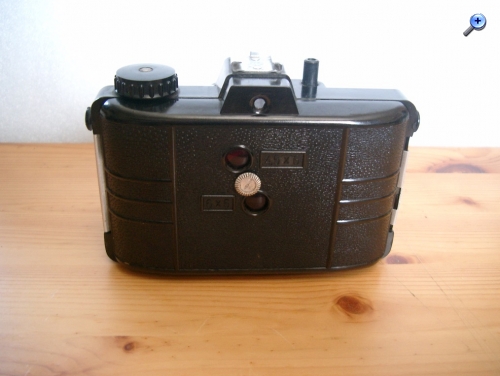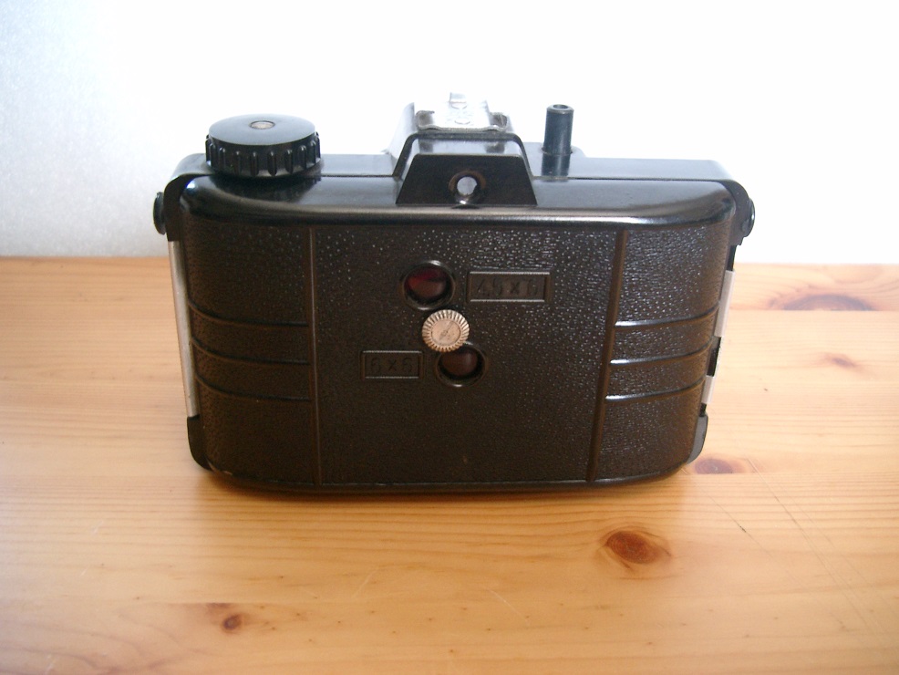 Rückseite (komplett abnehmbar): Durchsichtsucher mit Markierungen für das Format 4,5 x 6, Rotfenster für 6 x 6 und 4,5 x 6 mittels Drehrädchen umschaltbar