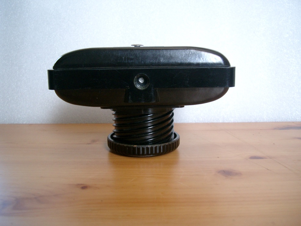 Oberseite: Drehknopf für den Filmtransport, Blitzschuh mit Gravur WZFO, Auslöser (funktioniert nur bei ausgefahrenem Objektiv) mit Brahtauslöseranschluß