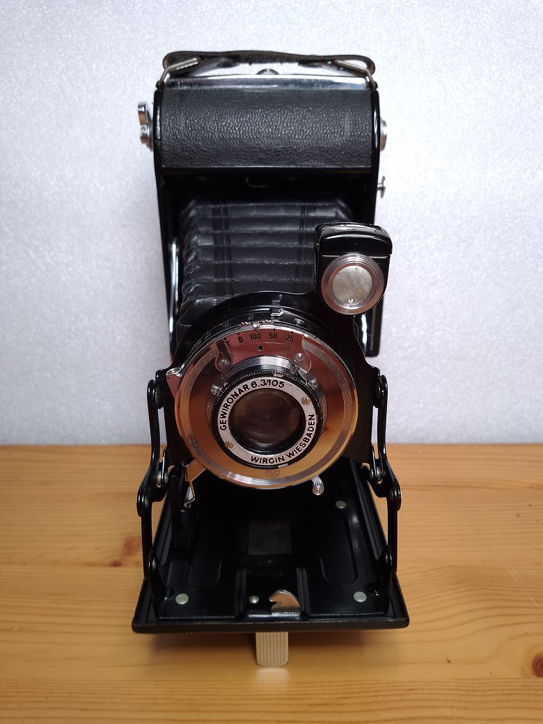 Hersteller: Wirgin, Wiesbaden Modell: Wirgin Auta Typ: Rollfilmfaltkamera (120er Rollfilm) mit Brillant- und Rahmensucher, 6x9 oder 4,5x6 cm Baujahr: 1949? Seriennummer: CF 2490 Verschluß: Gauthier, "T", "B", 1/25 - 1/100 sec, Drahtauslöseranschluß, nicht selbstspannend Blenden: 6,3 - 22 Objektiv: Gewironar Wirgin Wiesbaden, 1:6,3/105 Fokus: manuell, 1 Meter - unendlich