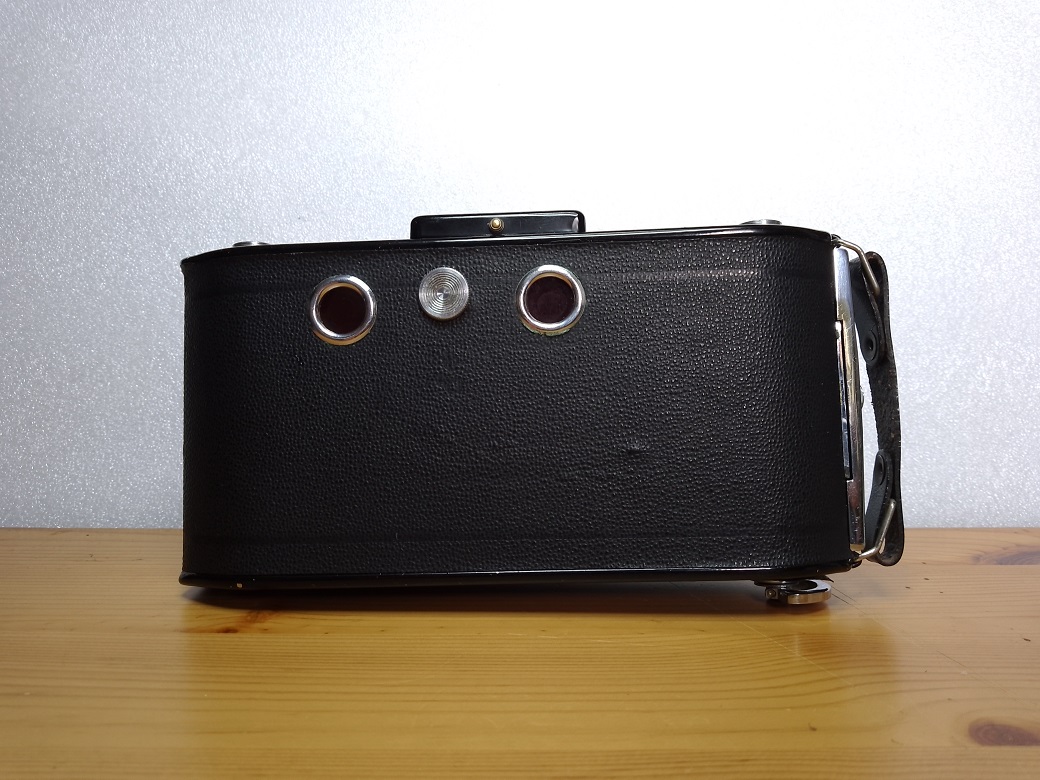 bei der nun vorzustellenden Kamera ist außer des Namens des Herstellers keinerlei Hinweis auf das Modell zu finden. Laut Internetrecherche handelt es sich um eine Wirgin Auta, vermutlich aus dem Jahre 1949. Die Wirgin Auta basiert auf einer Vorkriegskonstruktion, hat allerdings einige technische Veränderungen erfahren. So ist diese Kamera als Zweiformatkamera ausgelegt und kann Negative im Format 6x9 und mittels zweier Blechmasken (bei dieser Kamera erfreulicherweise noch vorhanden) auch im Format 4,5x6 belichten. Zum korrekten Filmtransport weist die Rückwand zwei durch ein Drehrad verschließbare Rotfenster auf. Eine weitere Neuerung ist der nun links auf dem Gehäuse befindliche Auslöser.