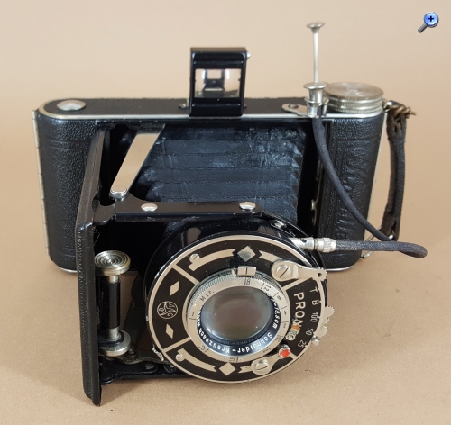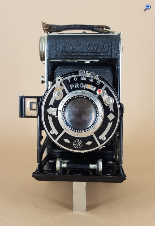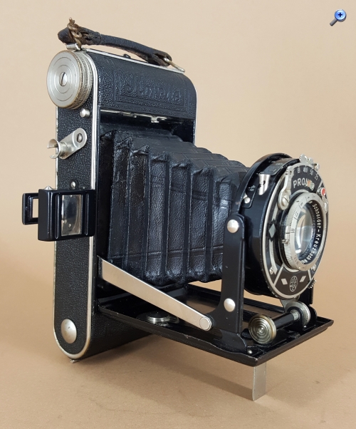 Das vorliegende Exemplar ist mit einem Schneider-Kreuznach Radionar 4.5/10,5 und einem Pronto-Verschluss ausgestattet. An anderen Ausstattungsvarianten habe ich noch das Ludwig Victar 6.3 mit Vario-Verschluss und das Radionar 4.5 mit Compur-Verschluss gefunden. Die hier vorgestellte Kamera ist für Rollfilmaufnahmen auf 120er Rollfilm im Format 6x9 vorgesehen. Es gab diese Korelle aber auch mit Einlegemaske für das Format 4,5x6. Die Kamera öffnet sich auf Knopfdruck und wird von Hand in die Aufnahmestellung geklappt. Um die Kamera wieder zu schließen, muss man die zwei Knöpfe unterhalb des Objektivs zusammendrücken. Die Fokussierung erfolgt über die Frontlinse.