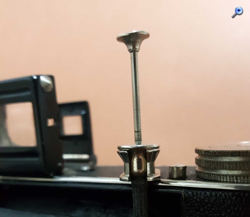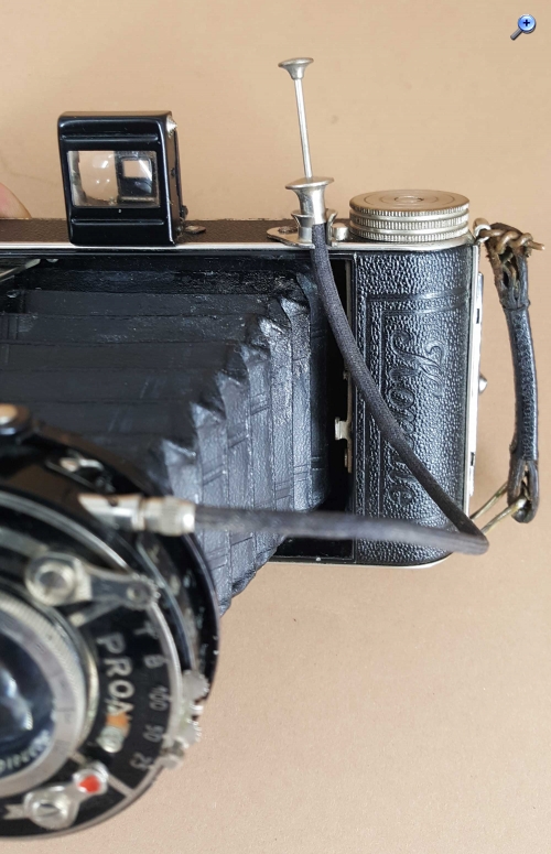Eine weitere interessante Einrichtung ist auch der Pseudo-Gehäuseauslöser bzw. Drahtauslöserhalter. Ich habe dieses Prinzip in ähnlicher Form schon an Plattenkameras gesehen, aber noch nicht an einer Rollfilmkamera.