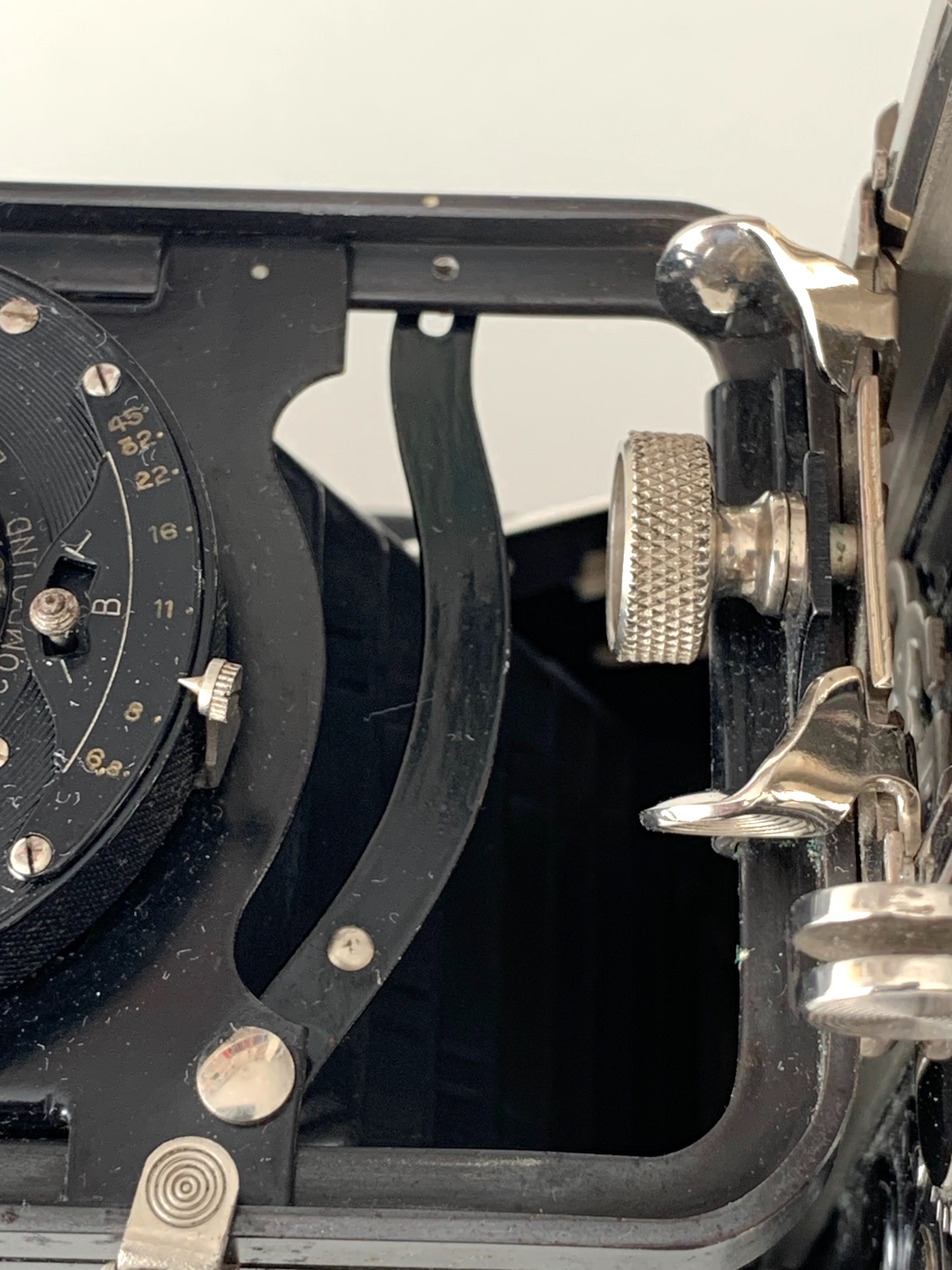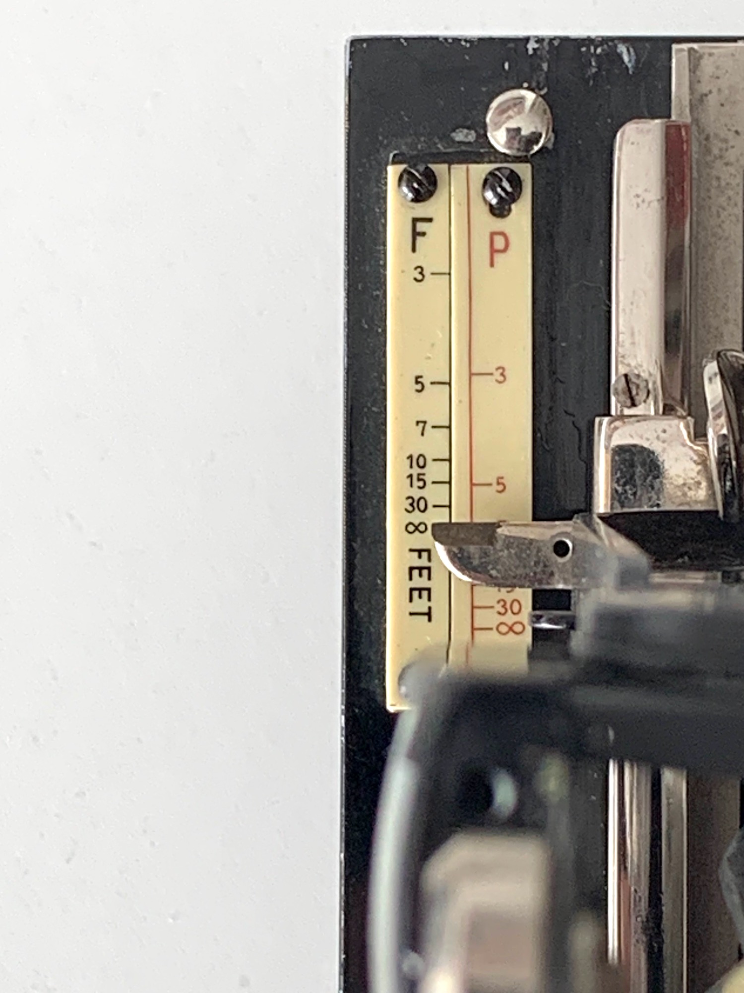 Bemerkenswert ist, dass die Kamera zwei Entfernungsskalen (hier in ft.) besitzt – für Rollfilm und Platte. Der Unendlich-Anschlag bezieht sich auf die Rollfilm-Skala.