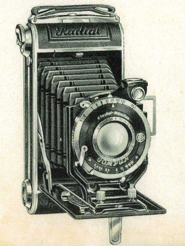 Die ältere dieser beiden Kameras ist unbezeichnet und kann auf Grund des verbauten Compur-Verschlusses und des Rodenstock Trinars 10,5 cm/ 4.5f auf ca. 1930 datiert werden. Für 91,50 RM war die Radial in dieser Ausstattung im Jahr 1930 zu haben.