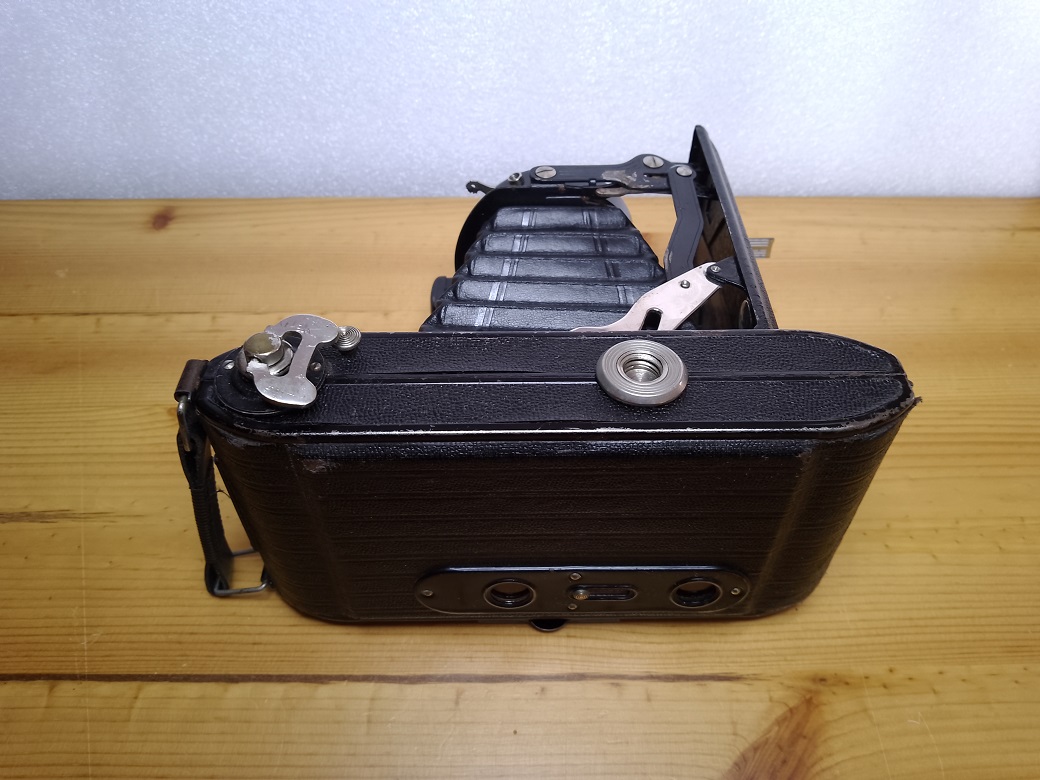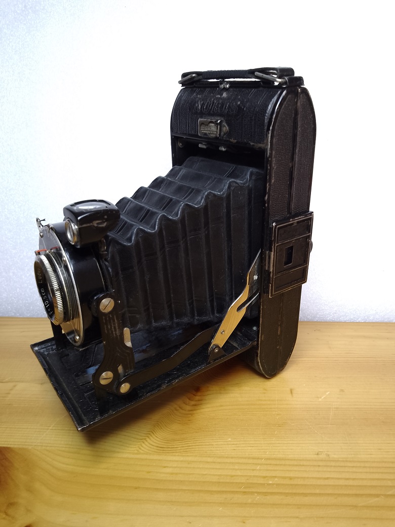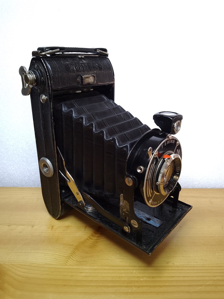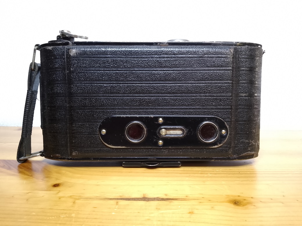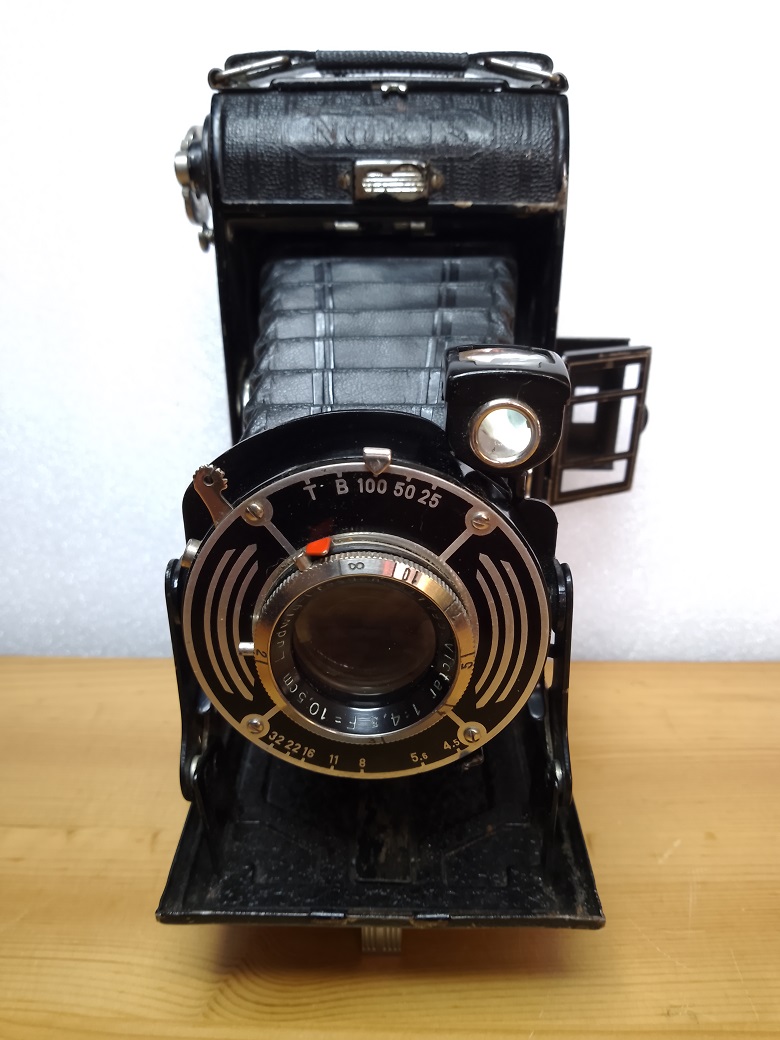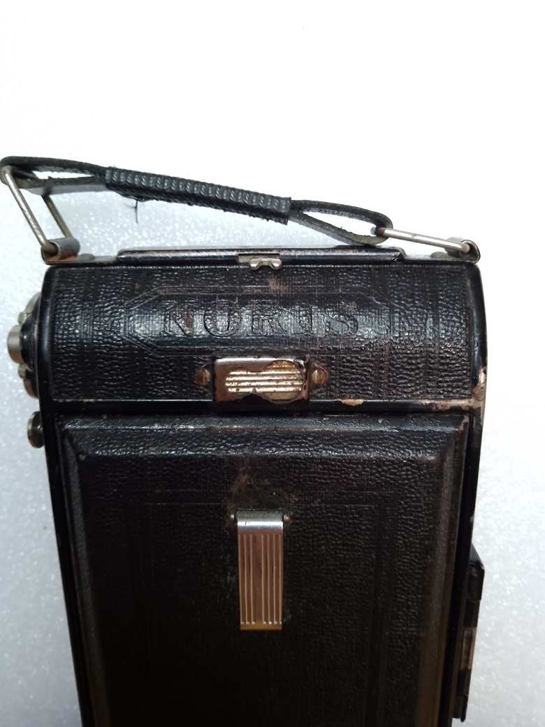 Ein solcher Großhändler war die Firma Conrad A. Müller & Co. in Strengenberg bei Nürnberg, der ab ca. 1934 die Balda Juwella unter der hauseigenen Marke "NORIS" (ohne weitere Bezeichnung) in seinem Programm führte. Bei der hier gezeigten Kamera handelt es sich um eine Zweiformatkamera für 6x9 und 4,5x6 Aufnahmen. Die für den Formatwechsel notwendige Einlegemaske ist leider im Laufe der Jahrzehnte verloren gegangen. Die Ausführung der Verschlußfrontplatte weist laut Camera-wiki.org auf ein Baujahr zwischen 1936 und 1938 hin. Verifizieren kann ich das leider nicht. Auf der Innenseite des Rückwanddeckels ist eine offensichtlich mit Bleistift geschriebene Seriennummer 26023 zu erkennen. Ansonsten weist die Kamera viele Merkmale der Balda Juwella auf. Auch die Klemmvorrichtung für den Drahtauslöser ist vorhanden.