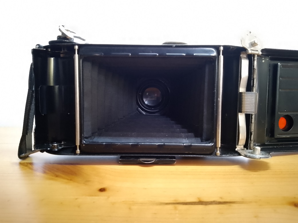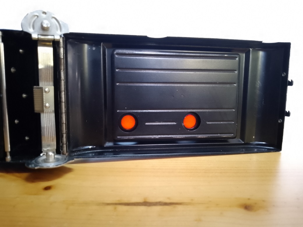 Rückseite: 2 verschließbare Rotfenster für die Formate 6x9 und 4,5x6, klappbare Rückwand mit Filmandruckplatte