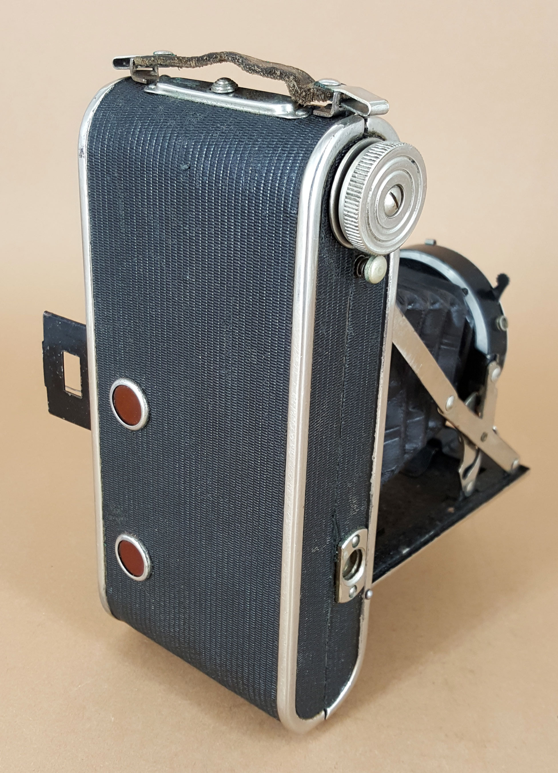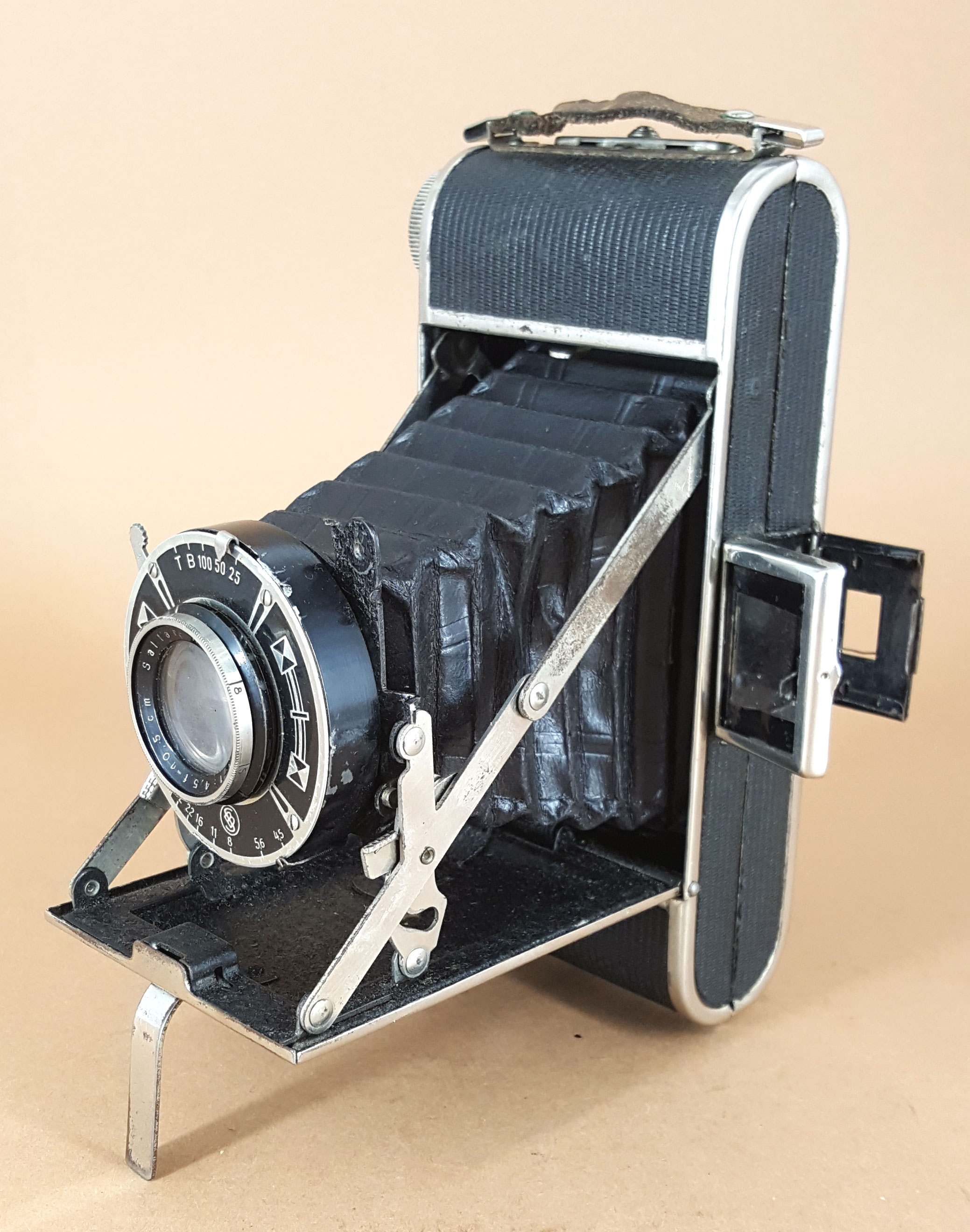 Diese Kamera ist mir wegen ihres schön gestalteten Verschlusses ins Auge gefallen. Die Kamera ist bis auf den Verschluss und das Objektiv unbezeichnet und da mir die Spreizenkonstruktion gänzlich unbekannt war, habe ich sie mitgenommen. Der Verschluss ist von Stein & Binnewerg Freital und als Objektiv ist ein „Saltar Anastigmat“ 4.5/10,5 cm verbaut. Eine Befragung der Suchmaschine bezüglich des Objektivs brachte keinerlei Ergebnis. Da „Saltar“ ähnlich wie „Weltar“, „Betar“ oder „Certar“ auf eine „Herstellermarke“ deutet, folgte ein Blick in das „Who is who“ von Thiele. Das brachte dann auch den entscheidenden Hinweis zur Identifizierung: unter dem Stichwort „Saltex“ fand sich der Verweis auf Johann Distler in Nürnberg und unter Distler dann der Hinweis auf die Saltex Rollfilmkamera.