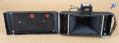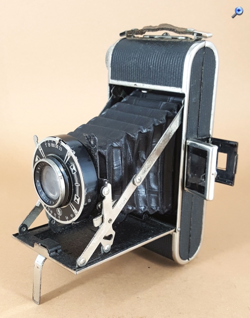 Die Kamera selbst verfügt über eine patentgeschützte Knickspreizen-Konstruktion (FA. Distler DRP 600740 vom Februar 1933). Ansonsten ist die Kamera (passend zu den einfachen Objektiven und Verschlüssen) recht einfach aufgebaut. Die Filmsichtfenster sind nicht verschließbar und es gibt keine Spulenhalter. Der Artikel von Riebe/Barz verweist zudem auf die schlechte Qualität der Vernickelung bzw. Verchromung, welche den heutigen Erscheinungszustand der meisten dieser Kameras erklärt. Auch meine Kamera kann als Beleg dafür dienen.