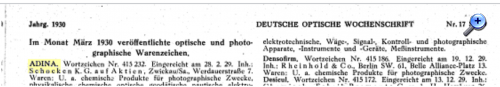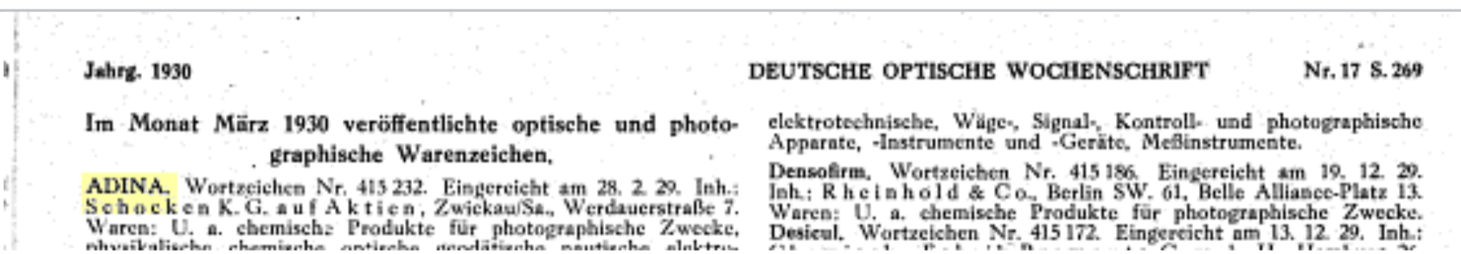 unter der Eigenmarke Adina bot das Kaufhaus Schocken seit 1930 fotografische Artikel an – neben Kameras auch Platten, Dunkelkammerzubehör und andere Produkte (Abbildung hier: https://filmeinwurf.ch/2020/10/07/schockens-kamera-adina/). Das Wortzeichen Adina war gemäß einer Notiz in der Deutschen Optischen Wochenschrift (Jg. 17 [1930], S. 269) am 28.02.29 eingereicht worden.