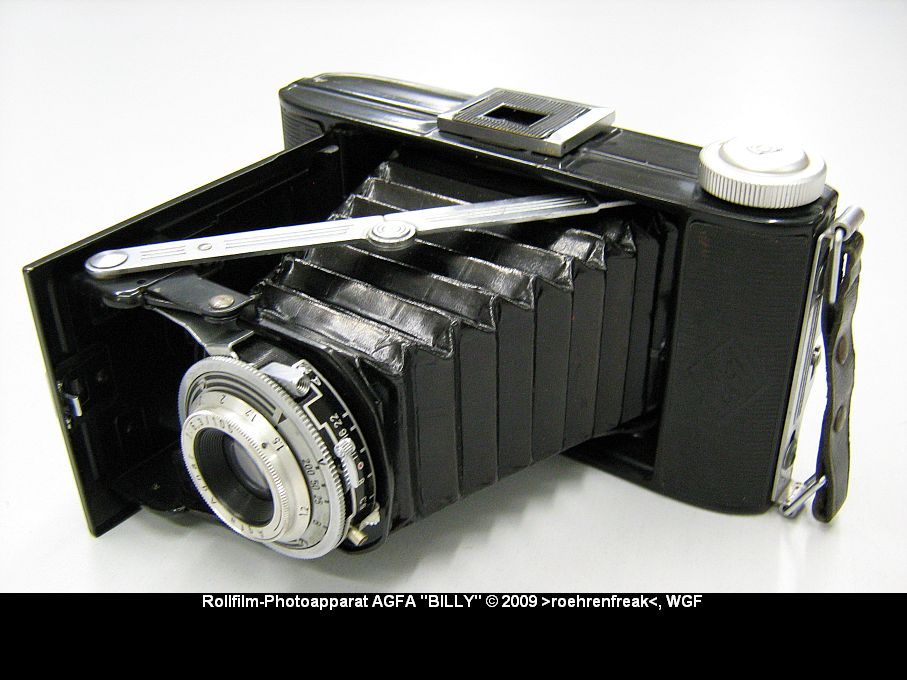 Hersteller: AGFA Typ: BILLY I Baujahr: um 1955 Objektiv: AGFA Agnar 1:6,3/105 Verschluss: VARIO 1/200, 1/50, 1/25, B Blende: 6,3 - 22 Entfern.: ab 1m bis "unendlich" Film: Rollfilm Transport: manuell Format: 9 x 6 cm Sucher: Rahmensucher