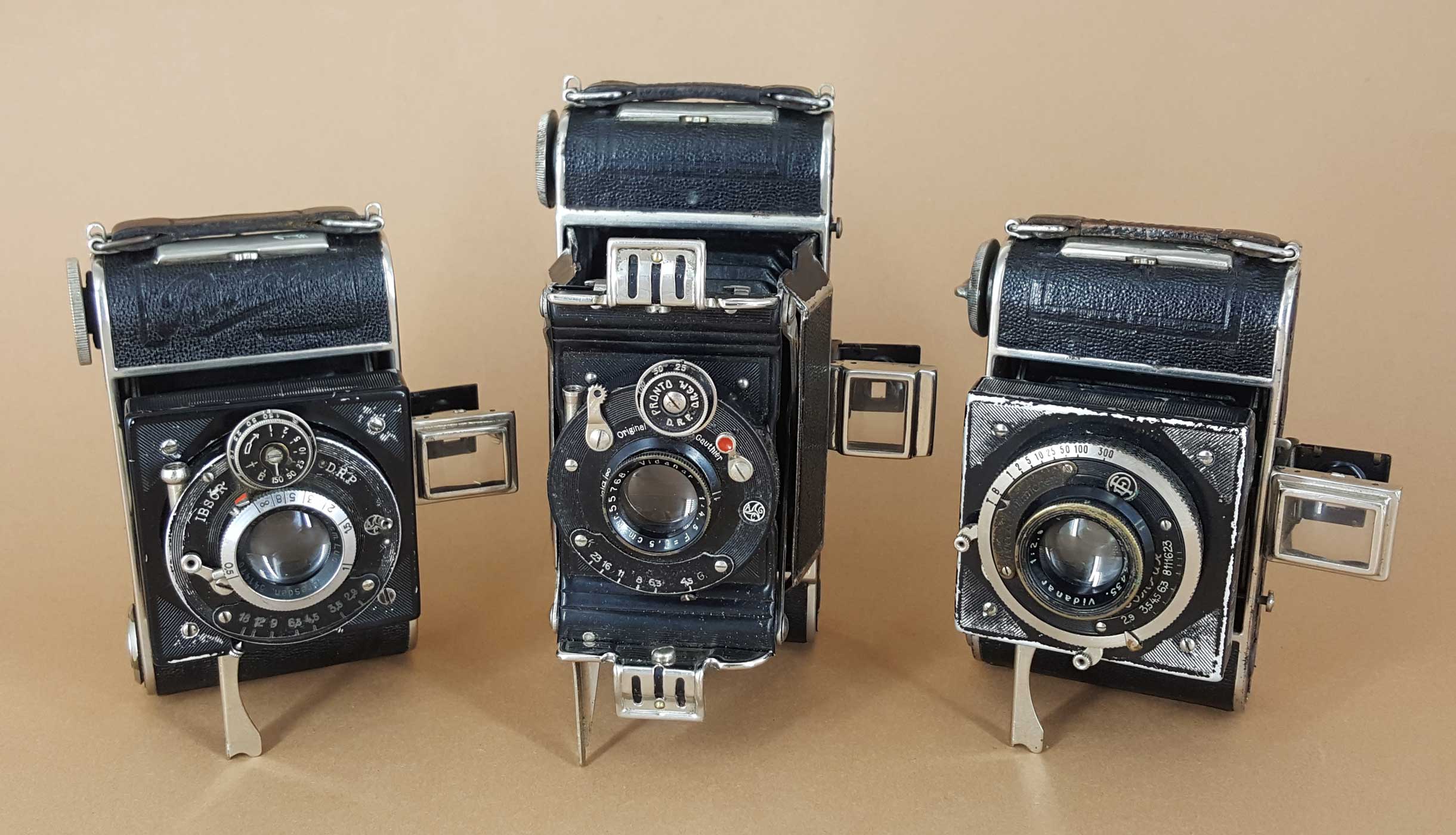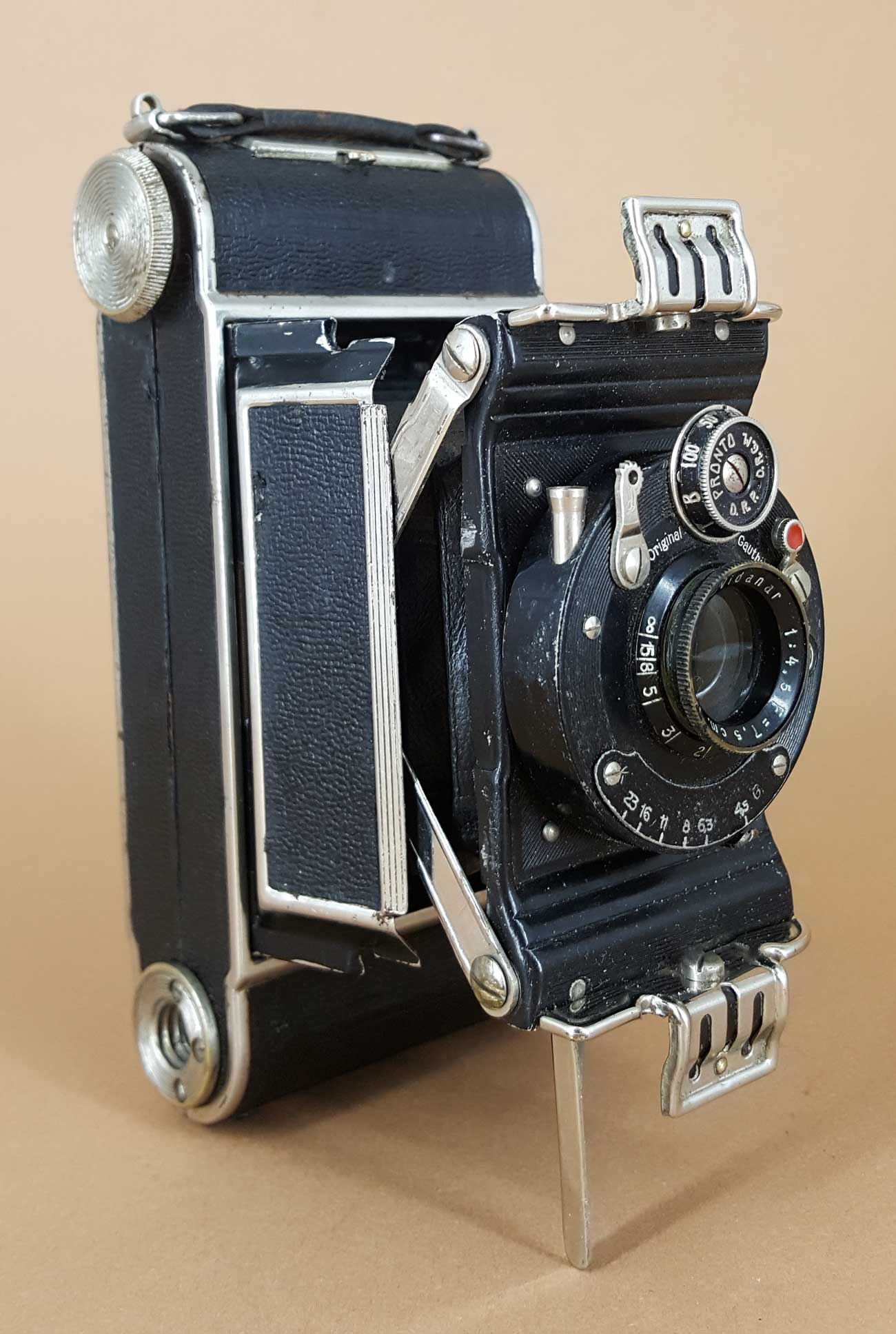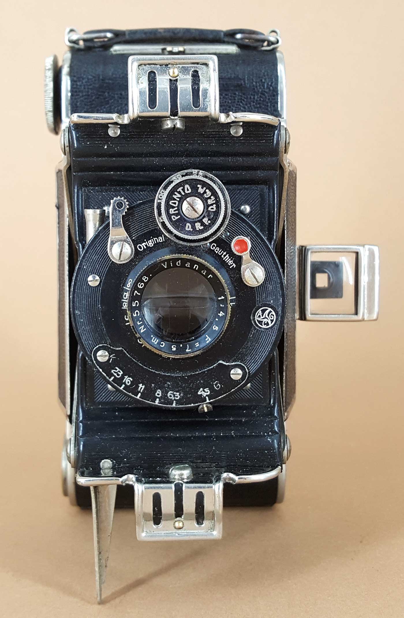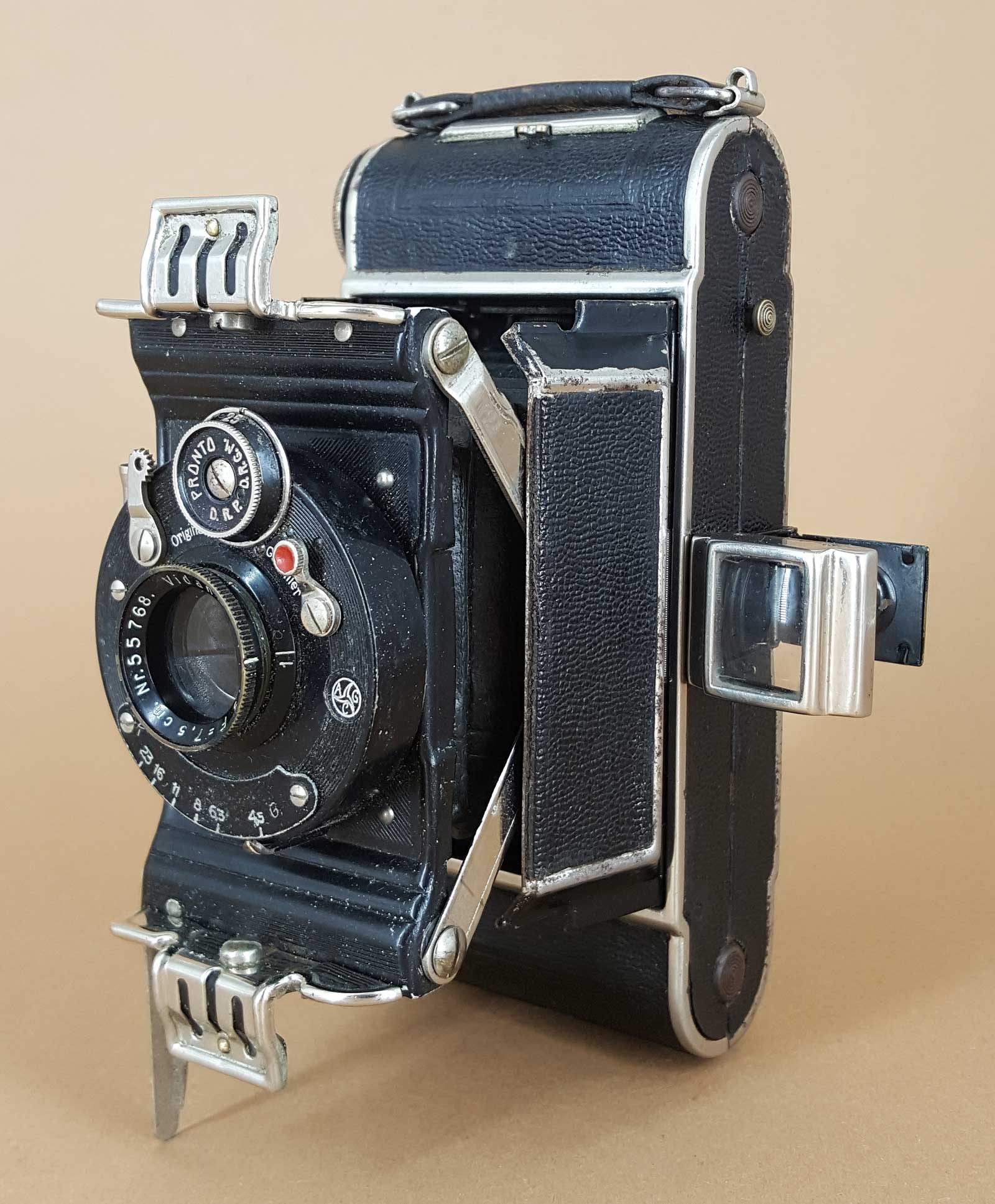 Die Verschlussausstattung reicht von Vario bis Ibsor (Compur habe ich noch nicht gesehen.) und die verwendeten Objektive gehen vom Baldanar 6,3 bis zum Trionplan 3,5. Das vorliegende Exemplar ist mit einem Ludwig Vidanar 7,5 cm f/4.5 F im AGC Pronto-Verschluss ausgestattet.