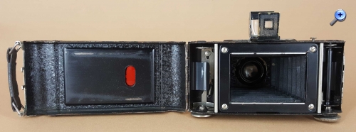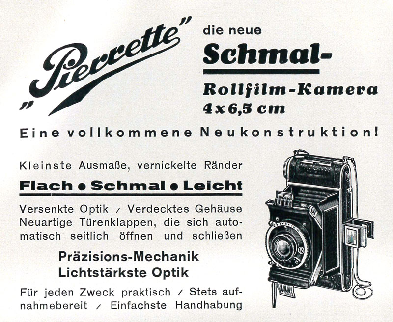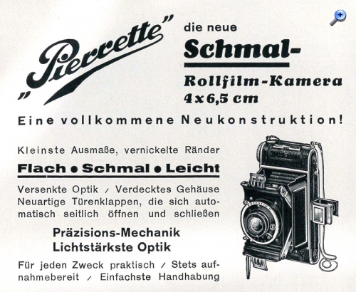 In der Werbeanzeige fällt mir der Trageriemen auf: Der ist offenbar als Kette oder Kordel ausgeführt; üblich waren seinerzeit Lederriemen. Könnte das ein Hinweis darauf sein, dass die Kamera als 'Damenkamera' konzipiert war? Darauf wird zwar nicht wie in anderen Fällen explizit hingewiesen, aber so eine Kette lässt die Kamera doch eher wie ein Modeaccessoire erscheinen...