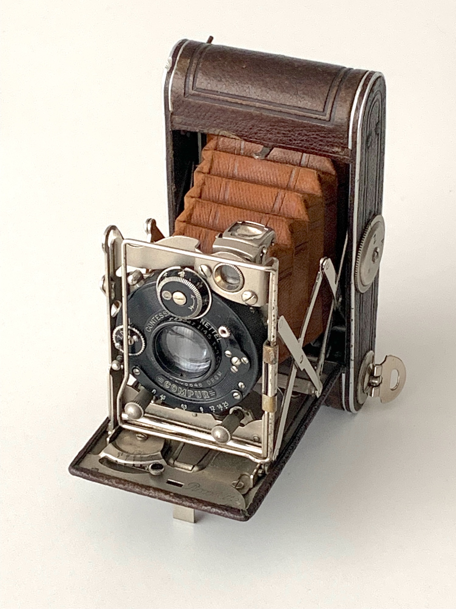 Die äußerliche Gestaltung mit dunkelbrauner Belederung, cognacfarbenem Balgen und silberfarben vernickelten Kanten entspricht dem üblichen Erscheinungsbild der Luxusversionen. Auch in technischer Hinsicht ist die Piccolette bestens bestückt – hier mit einem Tessar 4,5/7,5 in Rad-Compur.
