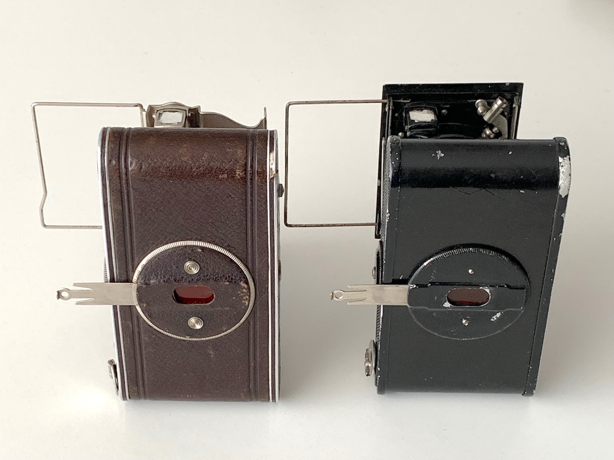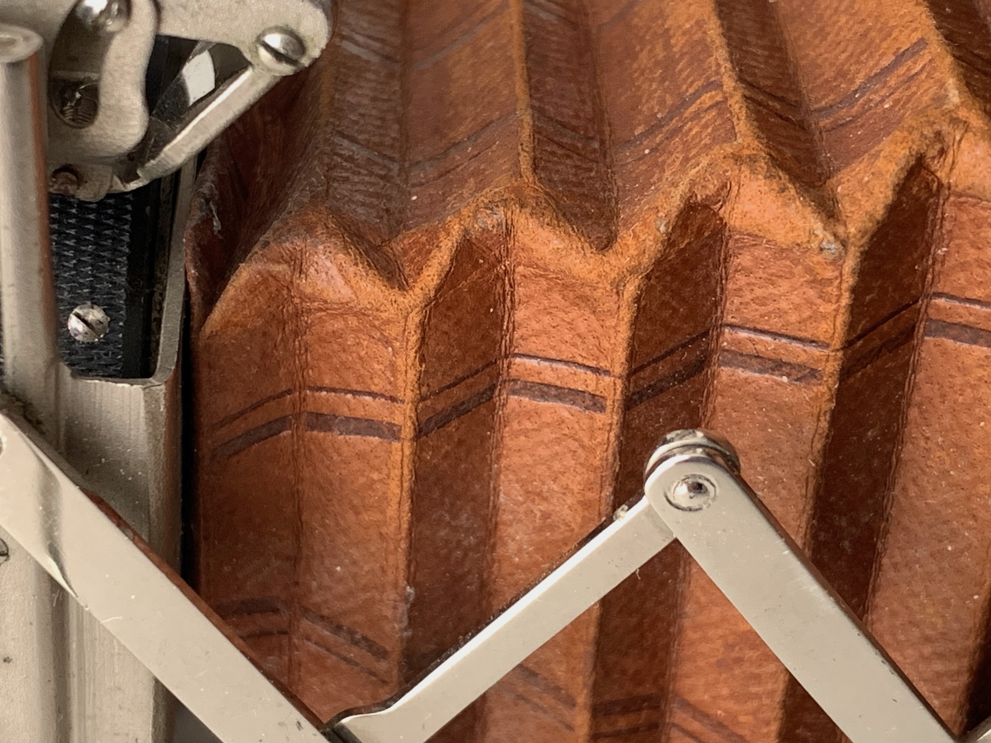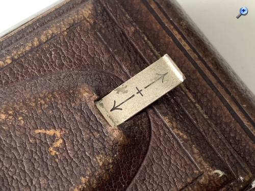 Die Konstruktion des Laufbodens ähnelt der der 1924 bzw. 1925 überarbeiteten Platten-Modelle Duchessa 4,5x6 und Sonnet; modellpolitisch handelt es sich bei der Luxus-Piccolette somit eher um die Rollfilm-Version zur Duchessa 4,5x6 (--> https://blende-und-zeit.sirutor-und-comp...0&page=2#14). Der Klappdeckel besitzt keine Spreizen zur seitlichen Befestigung; es ist keine Laufbodenkamera. Die seitlichen Schienen dienen allenfalls der zusätzlichen Stabilisierung des Spreizensystems. Damit der Deckel aufklappt, sind die Handhaben federnd gelagert, sie wirken sie Puffer, die den Deckel herausdrücken. Ungewöhnlich ist der Aufsteller, der nach vorn herausgezogen und dann nach hinten umgeklappt wird.