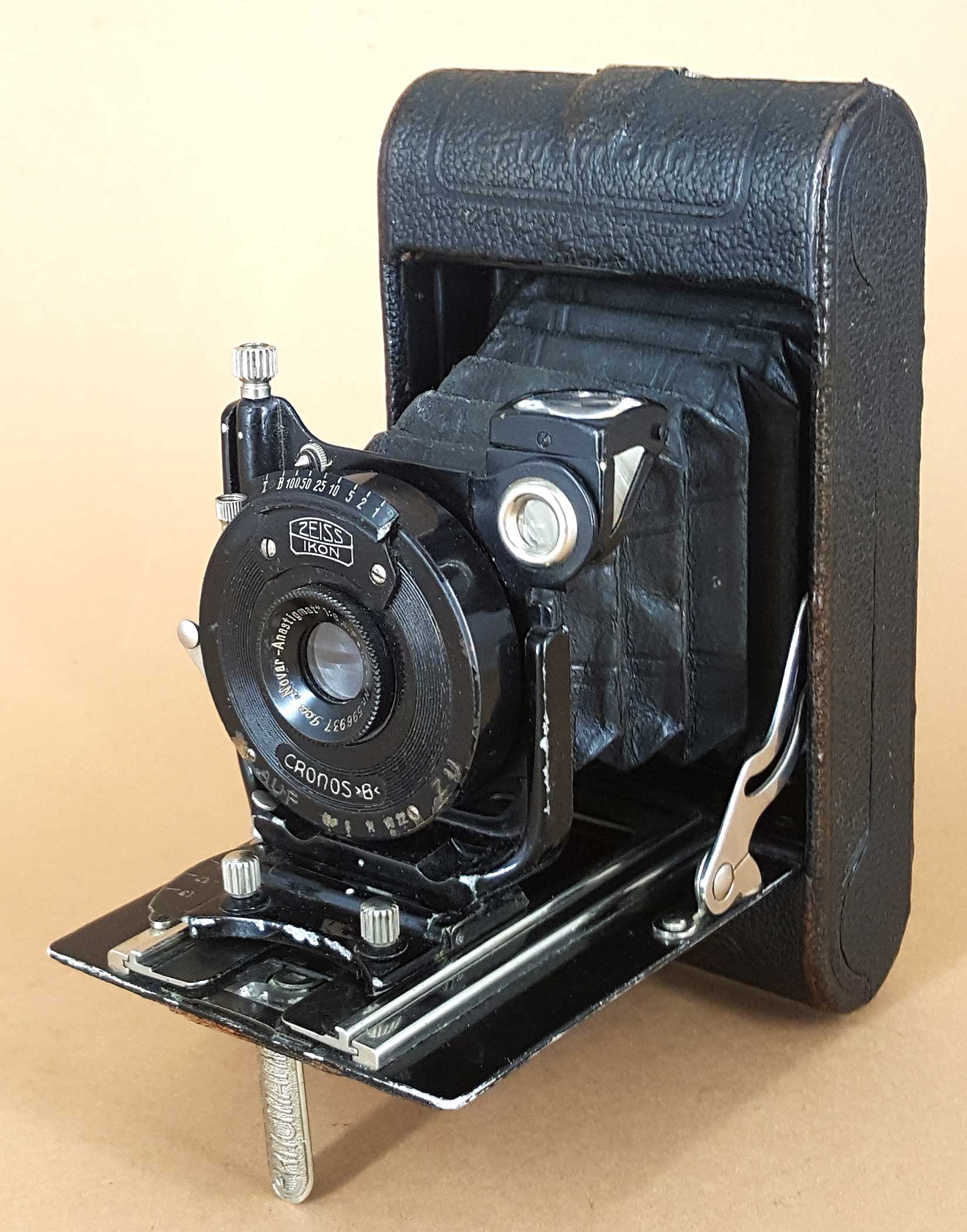 Ansonsten ist die Kamera mit allen Ausstattungsmerkmalen versehen, die Jan schon bei den zwei anderen Bob V Kameras beschrieben hat: einfacher Auszug, Kippstandarte, Fokussierung mit Radialhebel, Objektivträger seitlich verschiebbar und mit Einstellschraube höhenverstellbar, drehbarer Brillantsucher, Rotfenster ohne Verschluss und klappbarer Spulenhalter.