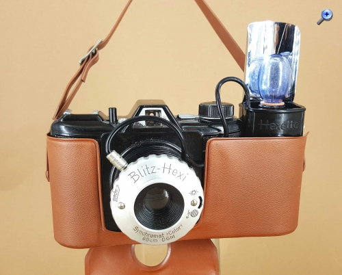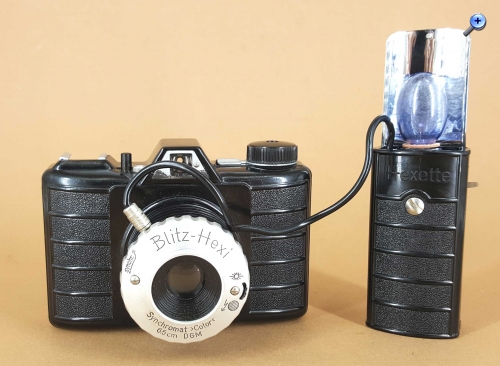 Die technischen Spezifikationen sind bei allen Modellen bis auf kleine Anpassungen gleich und beim Beitrag von Andreas nachzulesen. Die Hexi-1 besitzt im Unterschied zur P56 noch die Belichtungsmöglichkeit „T“. Die Blitz-Hexi ist im Unterschied zur P56 mit einem Synchromat Color 1:8/65 mm ausgestattet und wurde zusammen mit dem Blitzgerät „Hexette“ geliefert.