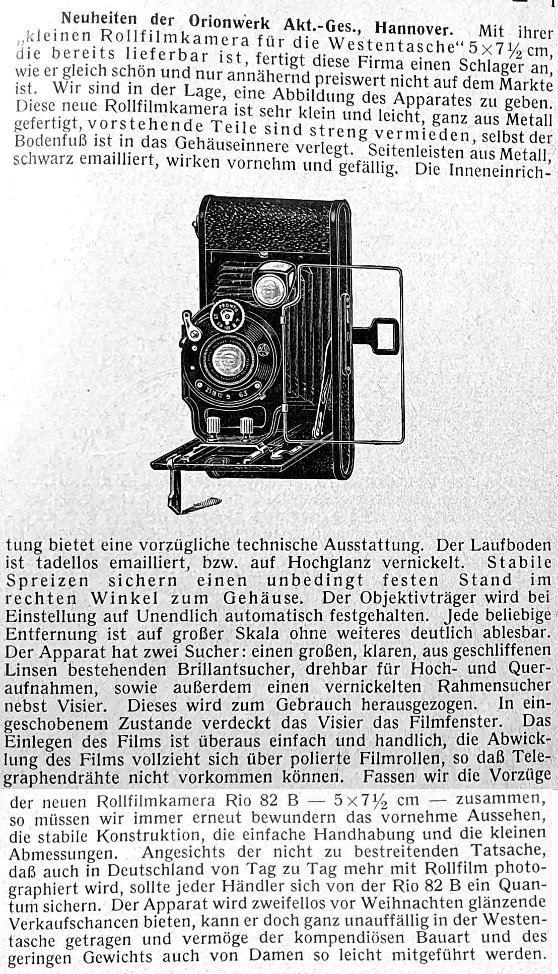 Die Rio 82 B kam Ende 1928 auf den Markt; Axel verweist unten auf einen Artikel aus der Photographischen Industrie vom November 1928, in dem die Kamera als Neuheit vorgestellt wird. Der Katalogauszug bei Kerkmann soll von 1932 stammen; die Kamera dürfte also bis zum Ende des Orionwerks im Programm geblieben sein. Viele Exemplare scheinen nicht verkauft worden zu sein, die Kamera ist nach meiner Wahrnehmung vergleichsweise selten zu finden.