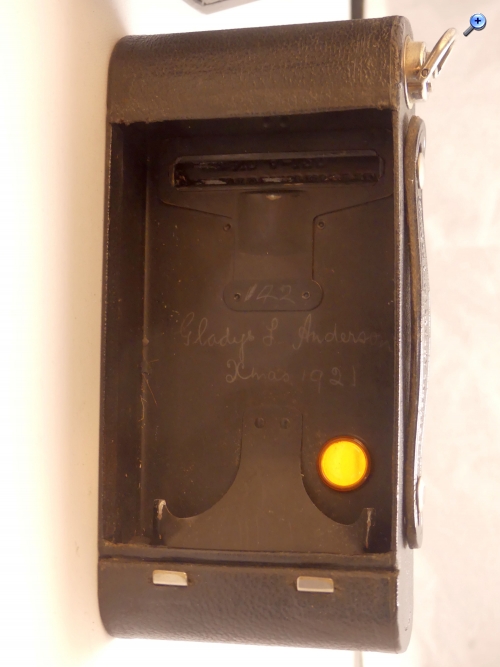 Hallo, eigentlich will ich gerade meine Sammlung etwas verschlanken um Platz für neues zu haben, dabei hatte ich einer meiner 2 Folding Brownies in der Hand, und beim öffnen und Prüfen hat sie ein kleines Geheimnis offenbart. Ausserdem war sie noch nicht im Museum, daher hier erstmal Details zur Kamera. Gebaut wurde die Folding Brownie No.2 von 1915-1926, also die komplette Zeit in der Kodak den autografischen Film vermarkten wollte, und es gab sie in verschiedensten Versionen, was es etwas schwierig macht, das genaue Baujahr fest zu machen. Bis 1916 waren die Bodys eckig, und ab etwa 1919 wurde der S förmige Standfuss durch einen C förmigen ersetzt. Sagt zumindest Kamera Wiki. Die Kamera hat die Verschlusszeiten: B/T/25/50 Blende geht von f8-f64 Fokus: Scheinbar zwei Einstellungen auf dem Laufboden 8 und 100 Feet/ 2,5-30 m wobei bei meiner zweiten noch eine fixed Einstellung dazu kommt. Die Klappe und der Stift für die autographic Funktion sind auf der Rückseite. Das Baujahr meiner Beiden Kameras kann ich dank Gehäuse und Standfuss auf 1917-19 festlegen, wobei ich die auf den Fotos, die andere reiche ich nach falls ich es nicht vergesse, für die ältere halte. Das Besondere an der Kamera ist ausserdem, dass sich der ehemalige Eigner im Gehäuse mit Bleistift verewigt hat. Ich lese: 42 oder 142 Gladys & Anderson Xmas 1921 Ob jetzt der Beschenkte die Schenkenden, oder die Beschenkten sich selbst, kann ich nicht sagen, ich vermute jedoch das erstere, auf jeden Fall vermutlich wohlhabende Kreise wenn sowas unter dem Bäumchen lag. Und natürlich sagt es uns dass die Kamera obwohl Baujahr vor 1919 erst 1921 verschenkt wurde. Ach ja noch hinzuzufügen wäre, dass die Kamera noch voll funktionsfähig ist.