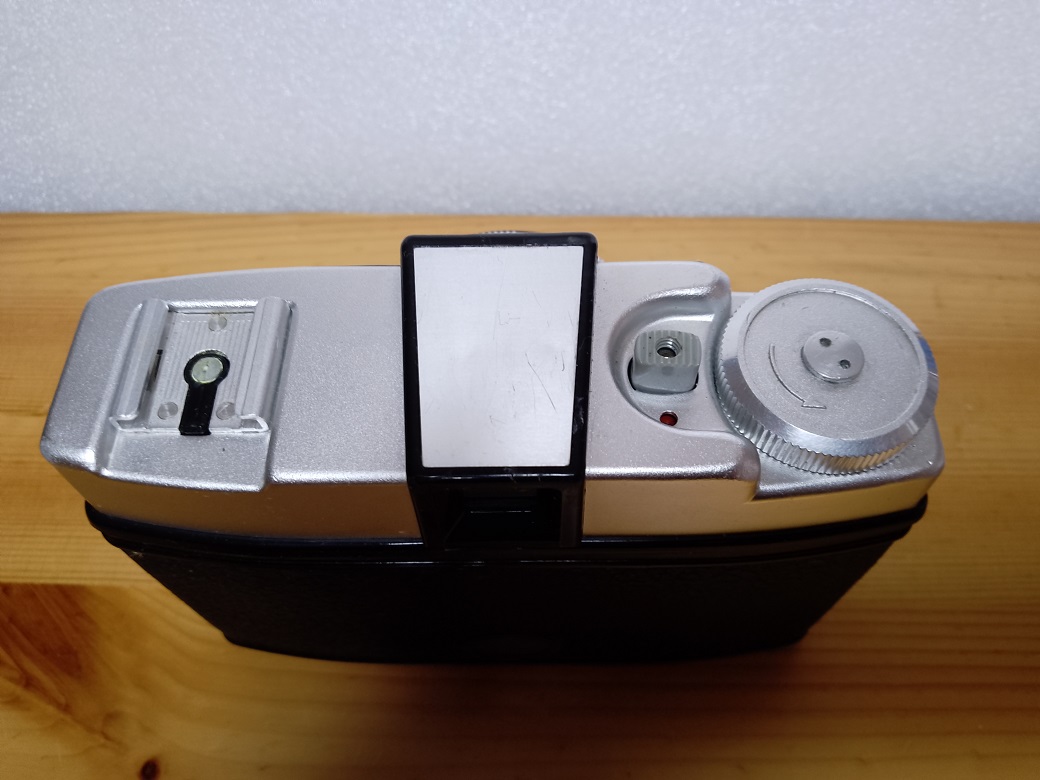Oberseite: Blitzschuh mit Mittenkontakt, Auslöser mit Drahtauslösergewinde, Kontrollfenster für die Doppelbelichtungssperre, Filmtransportknopf