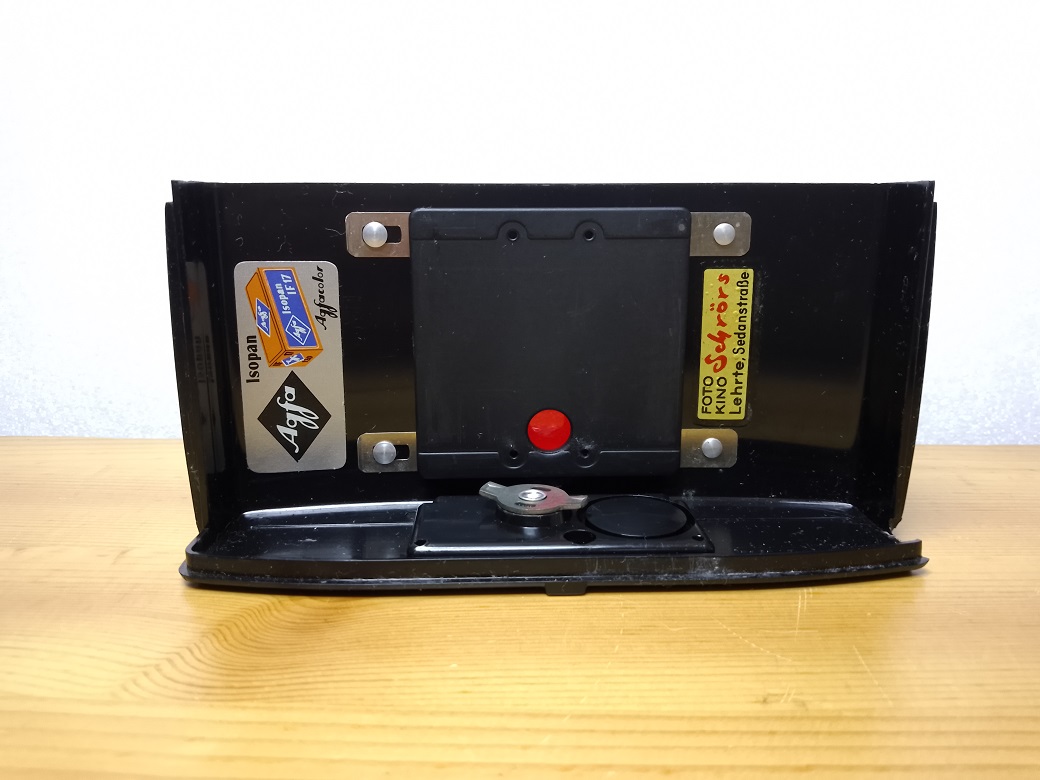 Rückseite: abnehmbare Rückwand mit Filmandruckplatte und Rotfenster