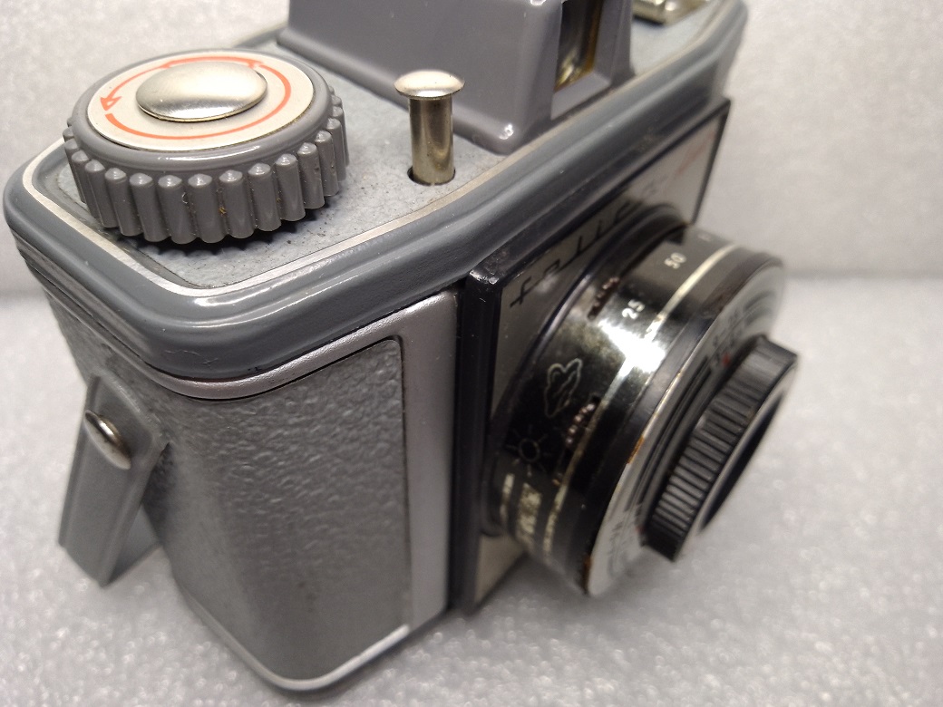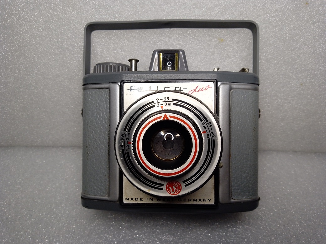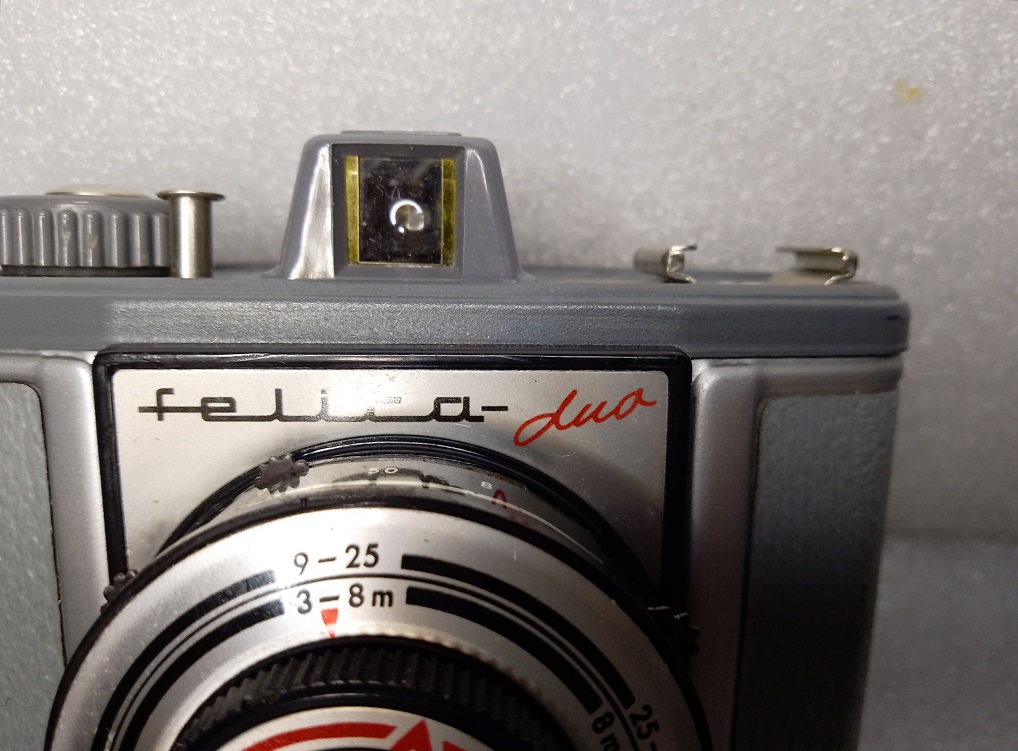 Hersteller: Vredeborch GmbH, Nordenham (Niedersachsen) Modell: Vredeborch Felica Duo Typ: Zweiformat Rollfilm (120) Sucherkamera für die Formate 6 x 6 (12 Aufnahmen) und 4,5 x 6 (16 Aufnahmen) Baujahre: 1958 - 1965 Seriennummer: 70564 Verschluß: Einfachverschluß, "B", 1/25 und 1/50 sek. Blenden: 8 (Wolken) und 16 (Sonne) Fokussierung: manuell, 1,5 - 3 Meter (4 - 9 ft.), 3 - 8 Meter (9 - 25 ft.), 8 Meter - unendlich ( 25 - inf.) Filmempfindlichkeit: alle