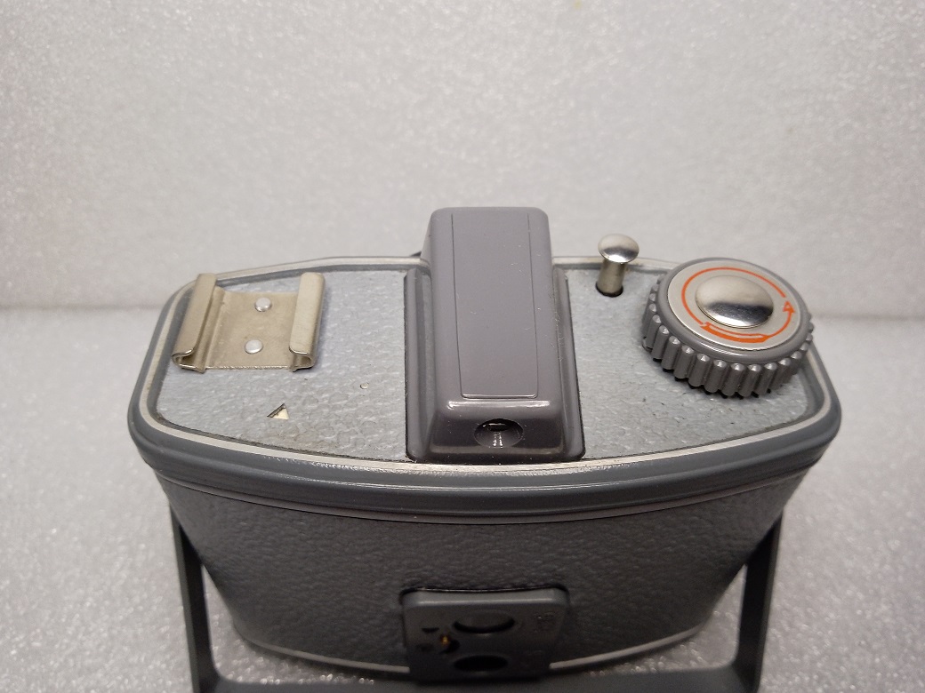Oberseite: Blitzschuh ohne Mittenkontakt (PC-Buchse am Objektiv), Fernrohrsucher, Auslöser, Filmtransportrad