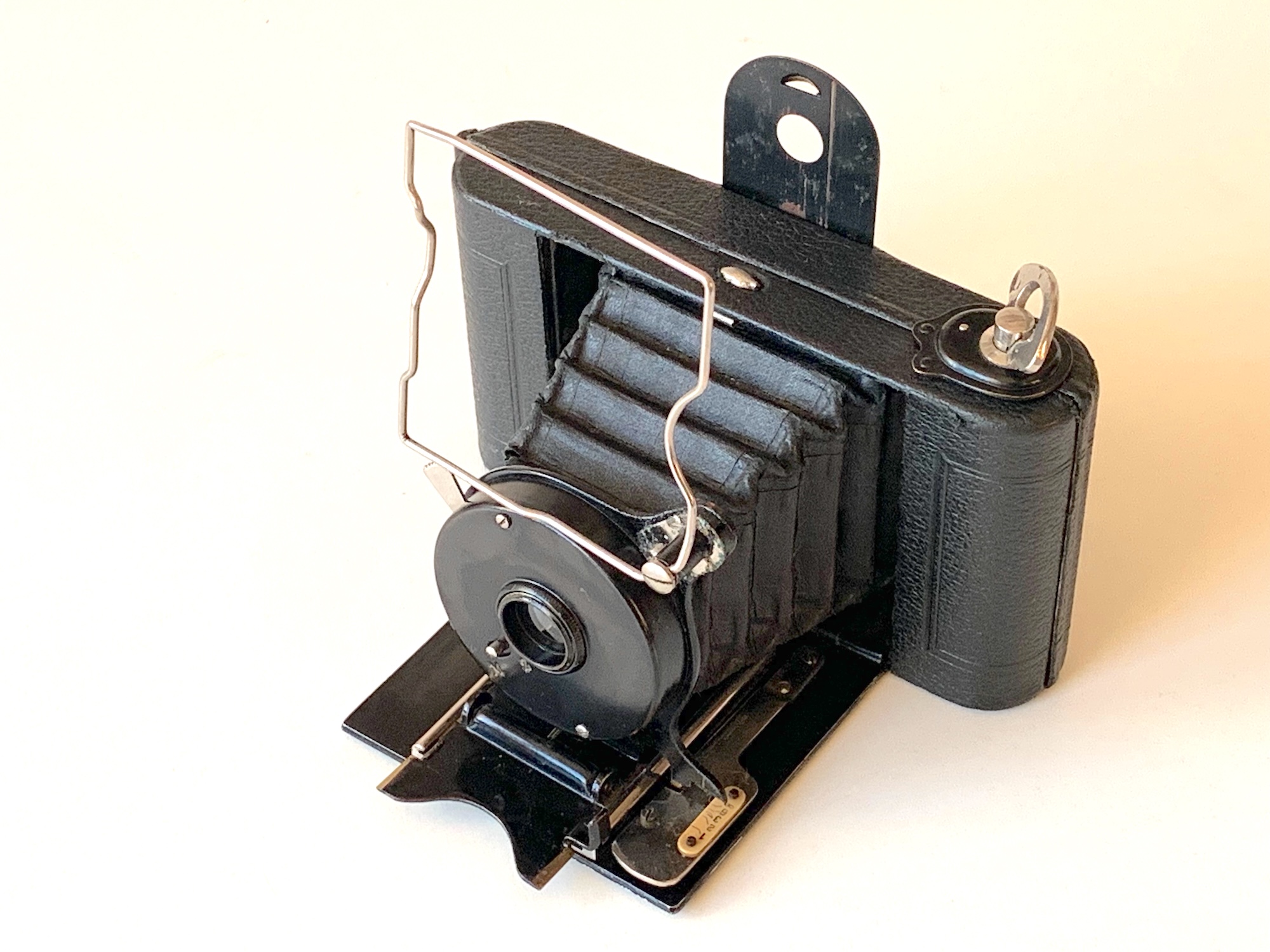 die hier vorzustellende Rollfilmkamera wirkt mit der nackten Frontplatte auf den ersten Blick wie eine kuriose Ausführung der Icarette 6x6 (Nr. 495). Man beachte auch die Befestigung des Ikonometers – und fehlt da nicht etwas? Nein: Die Kamera besitzt tatsächlich nur eine Spreize!