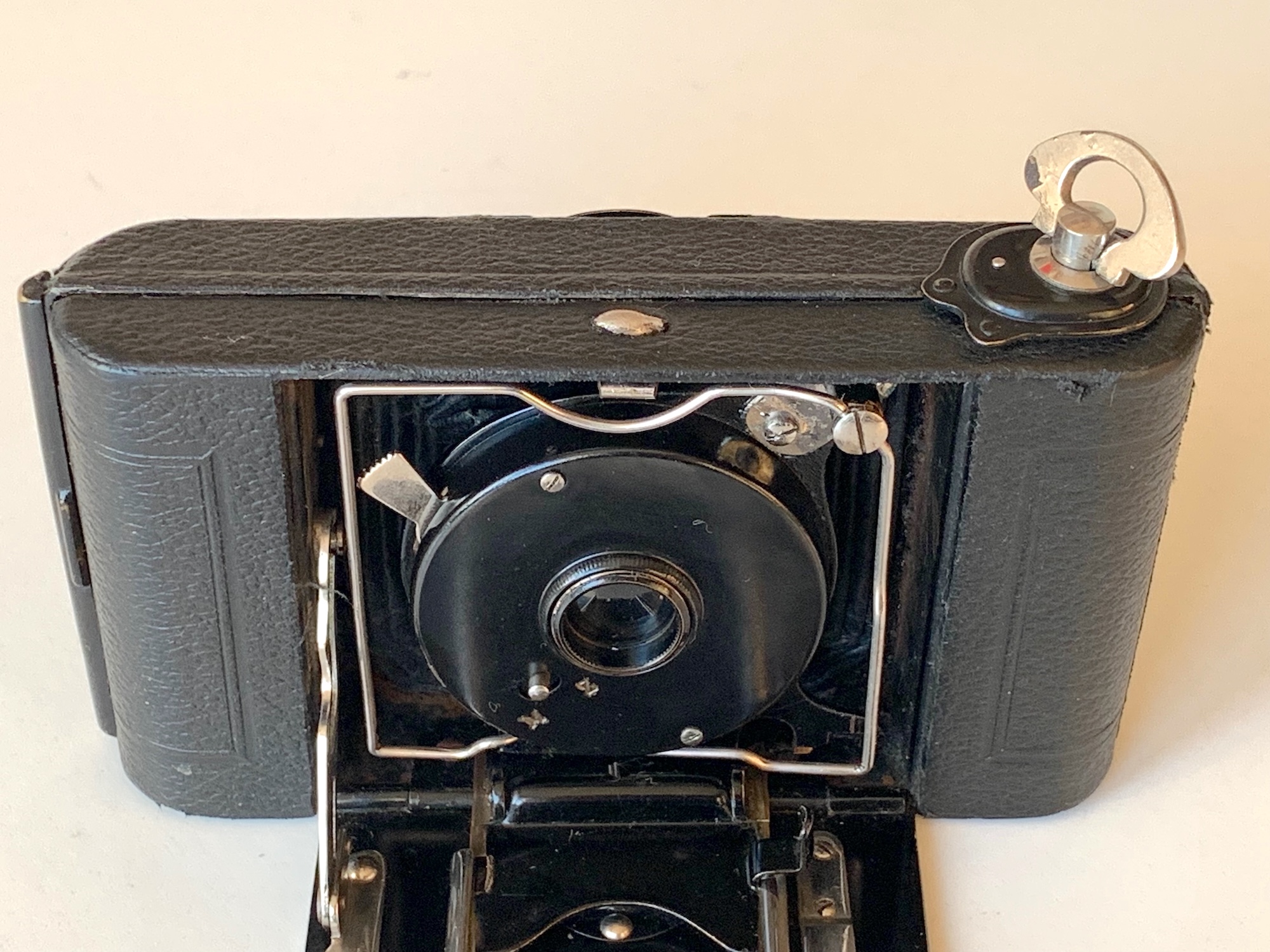 Die Ica Alpha 490 kann tatsächlich als eine Sparversion der Icarette betrachtet werden, mit der sie das Gehäuse gemeinsam hat (das bei der Alpha allerdings nur mit Kunstleder überzogen ist). Es handelt sich um eine Rollfilmkamera im Format 6x6 mit Laufbodenkonstruktion, eingerichtet für den Rollfilm BI (Kodak 117). Die Fokussierung erfolgt durch Verschieben des Schlittens; einen Radialhebel gibt es nicht. Verbaut ist ein Periscop 12,5/7,5 in einem einfachen Schleuderverschluss mit einer Momentzeit (ca. 1/40) und Z und „fester Ziehblende“, wie es im Katalog 1919 heißt. Den Schieber für die Lochblende kann ich an meiner Kamera nicht finden. Das bei Sylvain Halgand (collection-appareils.fr) abgebildete Exemplar besitzt auf 12 Uhr einen Schieber: „Le diaphragme se résume à une plaque métallique munie de deux tous de diamètres différents que l'on actionne de haut en bas pour choisir l'ouverture“ (https://www.collection-appareils.fr/x/ht...d_appareil=9999). Möglicherweise gab es hier eine Serienänderung. Im Katalog 1922 wird die "Ziehblende" nicht mehr erwähnt. Da keine weiteren Bedienungselemente vorhanden sind, wirkt die Front sehr spartanisch – oder aufgeräumt.