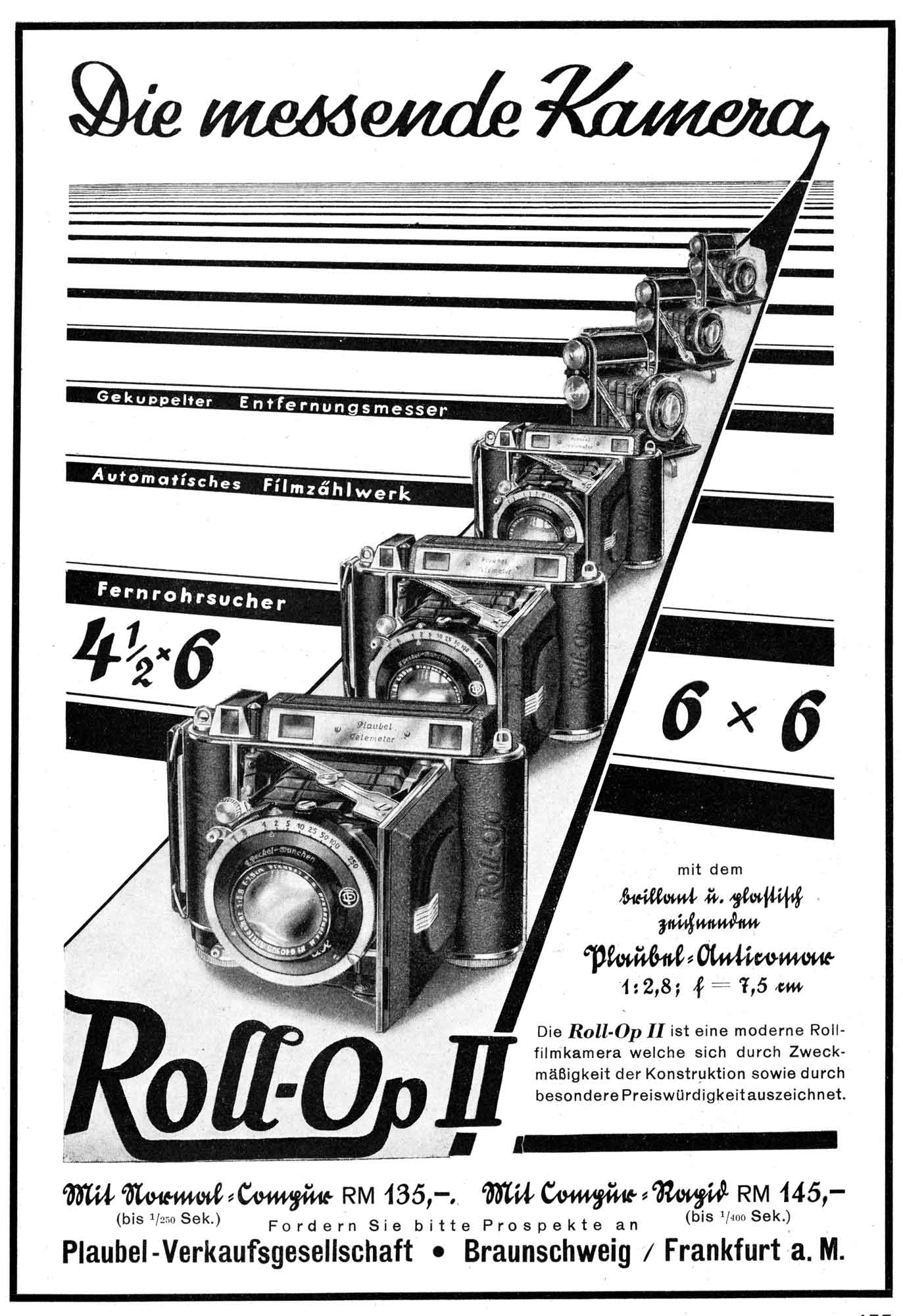 Die Roll-Op II wurde zur Frühjahrsmesse 1935 zunächst nur im Aufnahmeformat 4,5x6 herausgebracht, doch schon wenig später folgte die hier vorzustellende Variante im Format 6x6. Bereits 1934 hatte Plaubel die Roll-Op I auf den Markt gebracht – eine Sucherkamera im Aufnahmeformat 4,5x6 (später auch 6x6), die das Gehäuse der Balda Baldax verwendete und mit einem Plaubel Anticomar ausgestattet war. Auch die Roll-Op II verwendet das Baldax-Gehäuse, sie besitzt aber im Unterschied zur Roll-Op I einen gekuppelten Entfernungsmesser und ein automatisches Filmzählwerk.